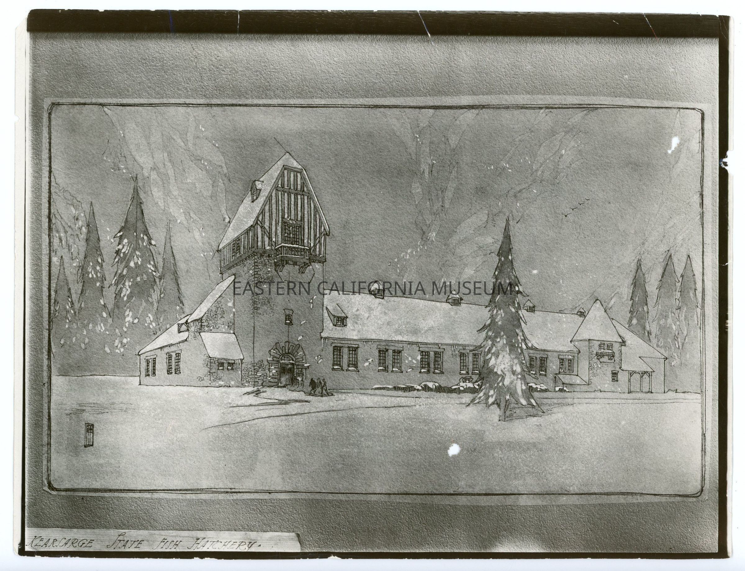 Photo of an ink drawing of a winter scene titled, "Kearsarge State Fish Hatchery." The name was later changed to the Mt. Whitney Fish Hatchery.