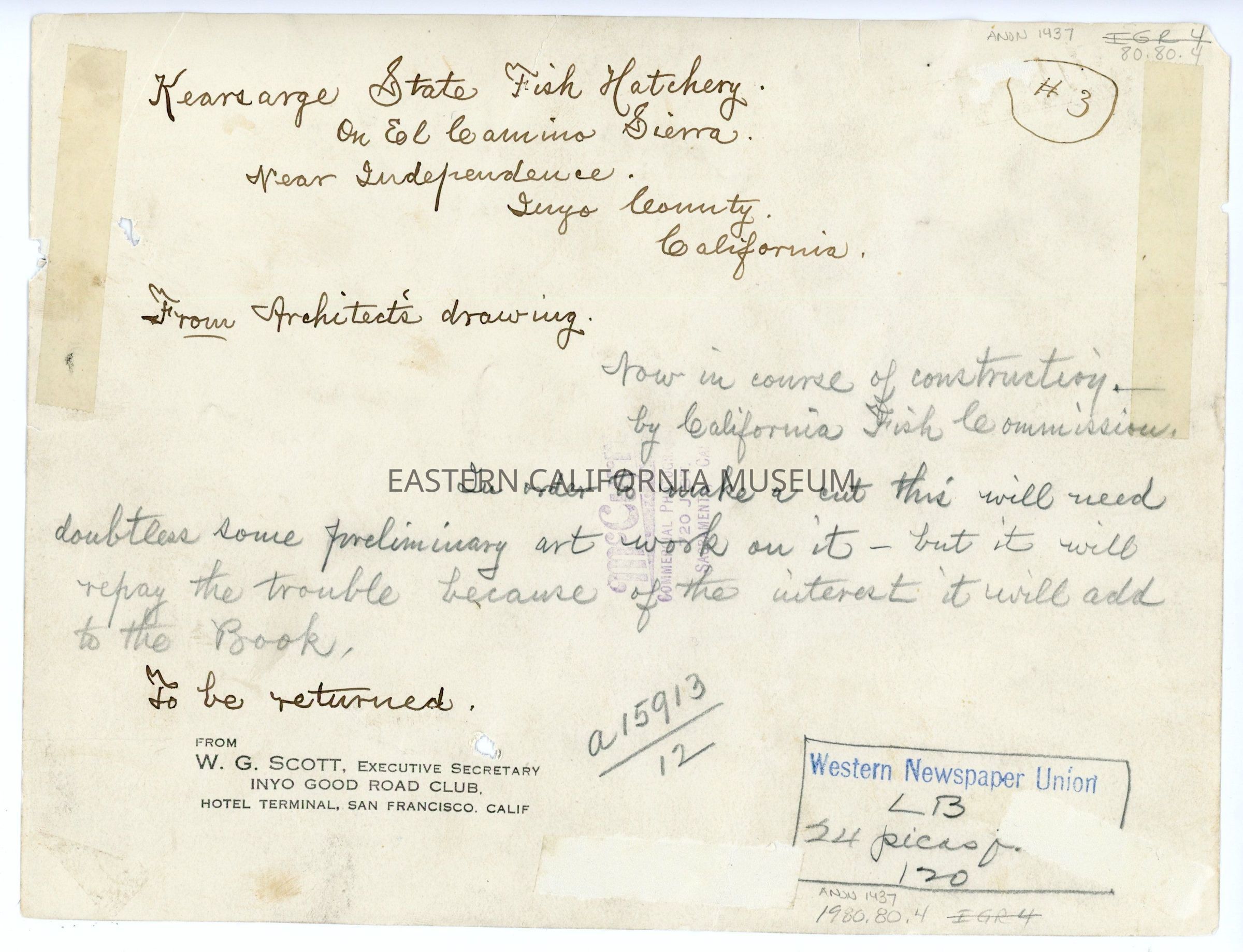 Written in various pens and pencils on reverse: #3. Kearsarge State Fish Hatchery on El Camino Sierra near Independence, Inyo County, California. From Architect's drawing. Now in course of constructing by California Fish Commission. In order to make a cut this will need doubtless some preliminary artwork on it--but it will repay the trouble because of the interest it will add to the book. To be returned. A15913/12.