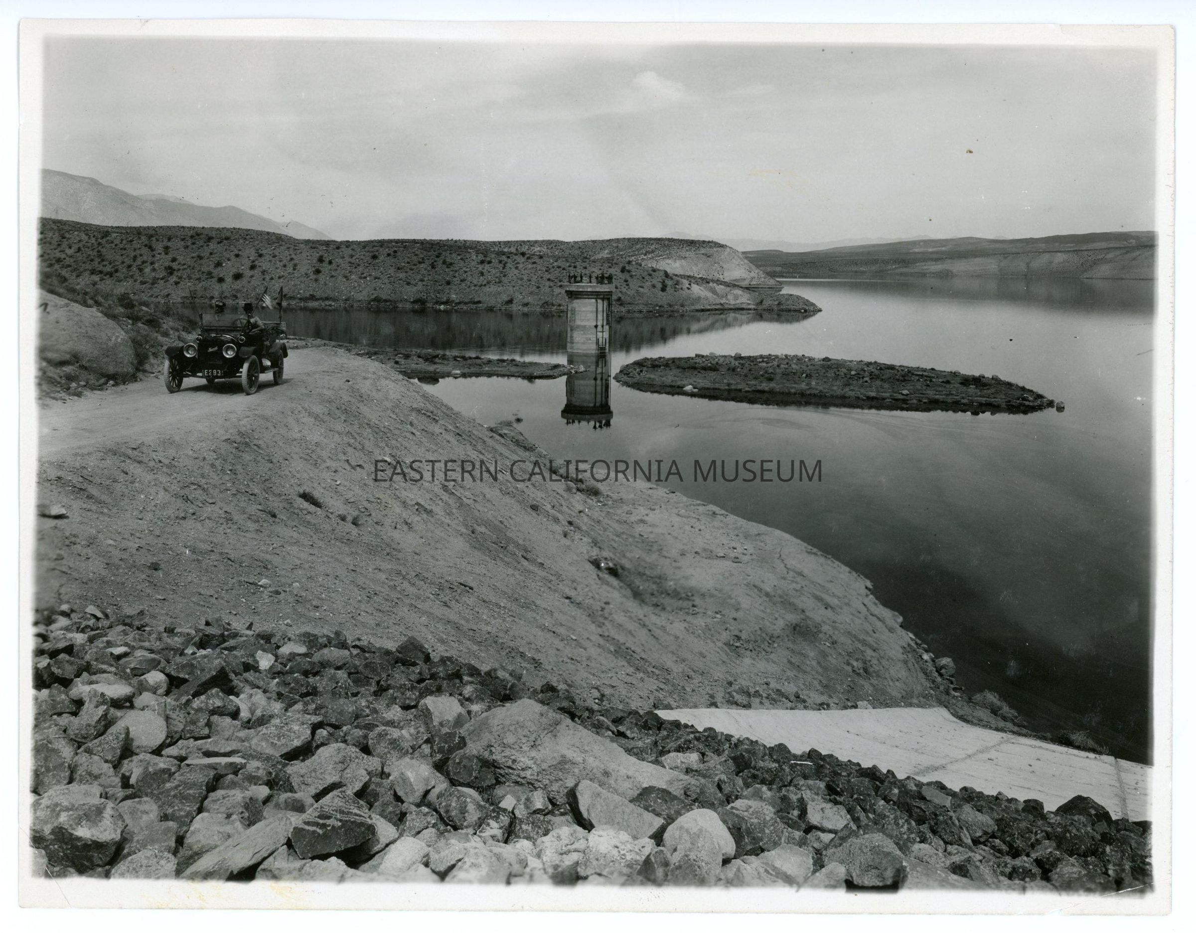 Photo of an automobile parked on a dirt road overlooking Haiwee Reservoir. There are two men in the car (it looks like one is wearing driving goggles), and it is flying an American flag. The license plate is "E293." A concrete tower is visible in the water--the outlet tower?