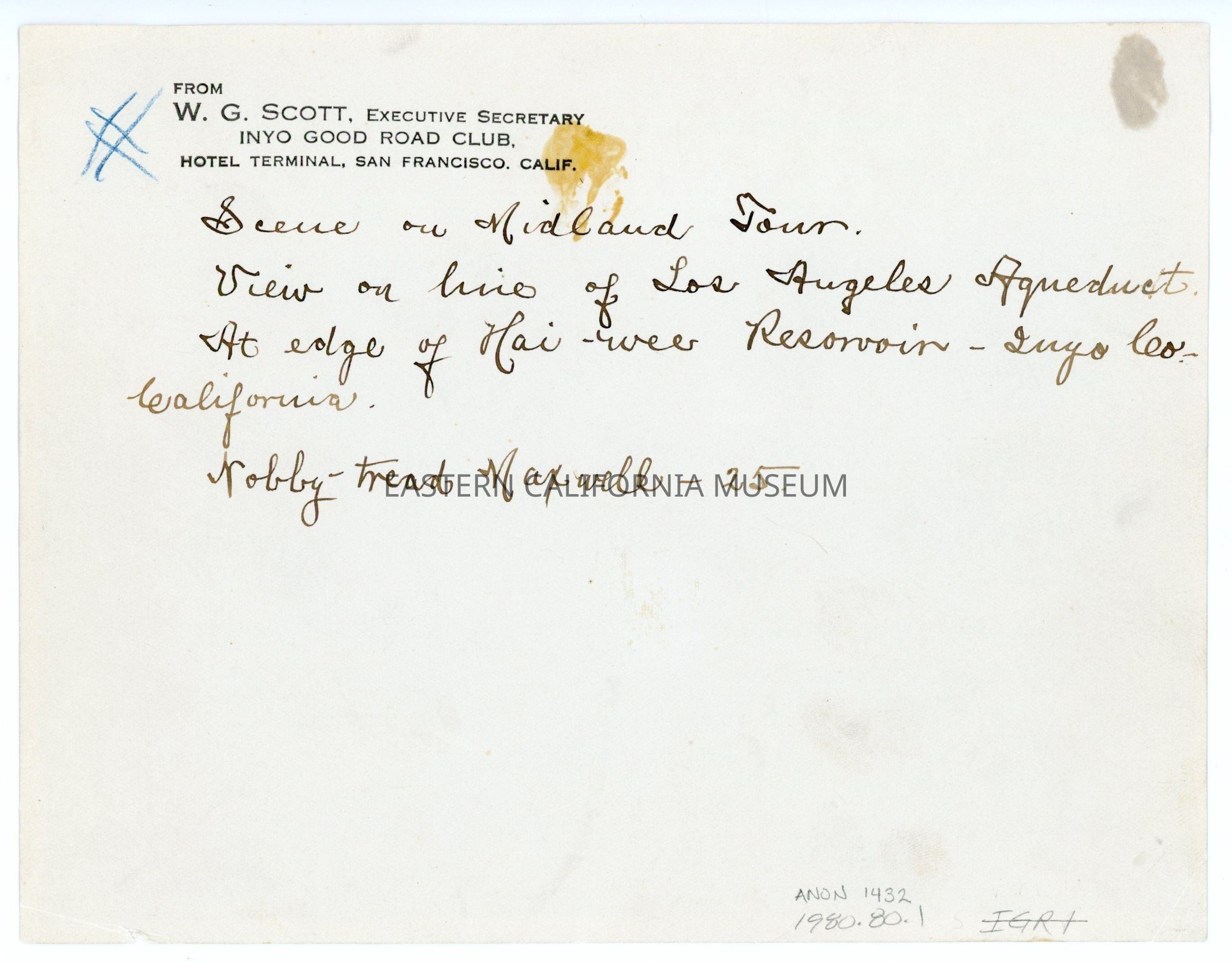 Stamped in black ink on reverse: From W. G. Scott, Executive Secretary, Inyo Good Road Club, Hotel Terminal, San Francisco, Calif.