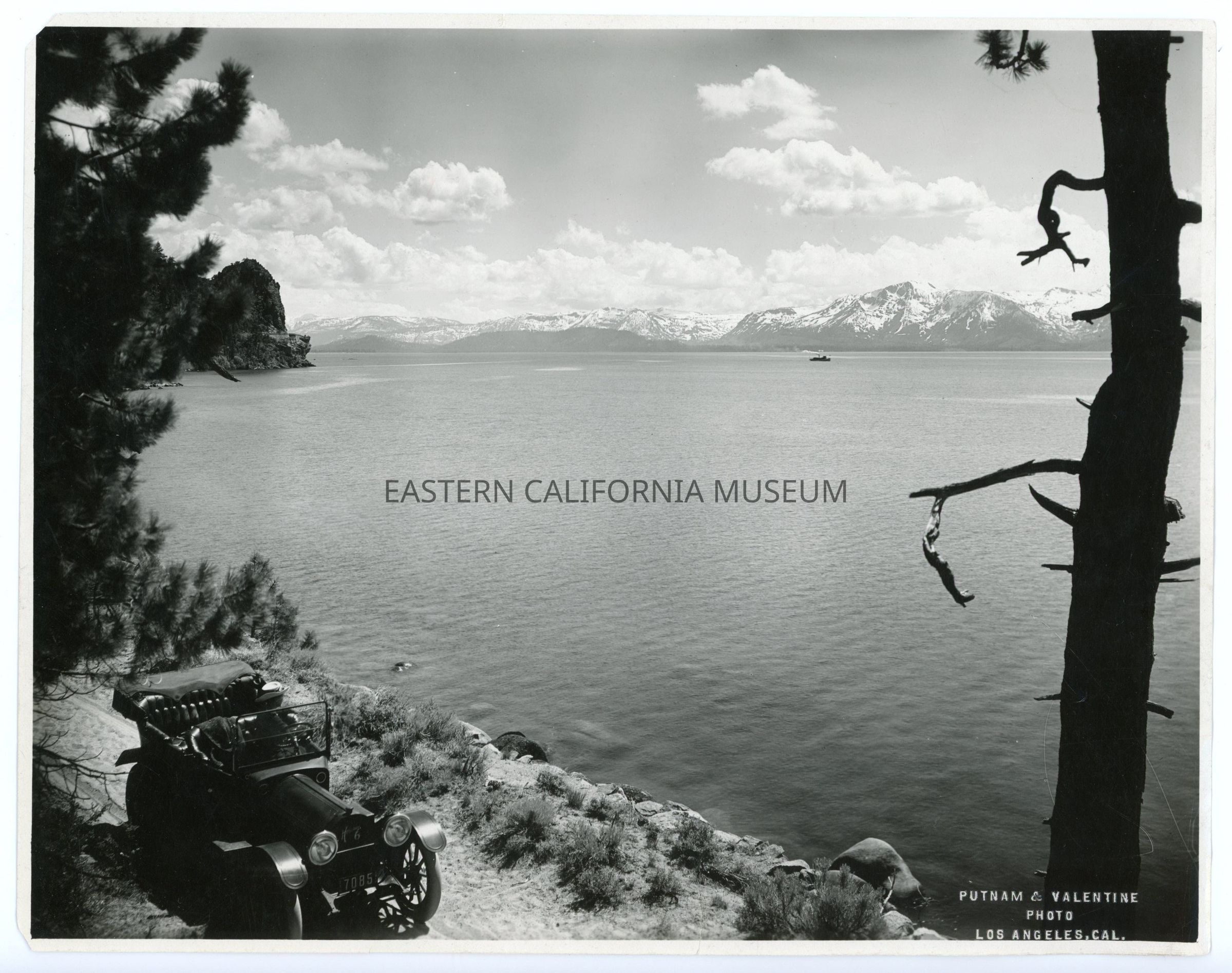Photo of an automobile parked along the edge of a large lake with snow-covered mountains on the opposite shore. There is a boat on the lake. There is one person sitting in the car, which has the license plate "7085." It was taken or printed by Putnam and Valentine of Los Angeles, whose name is embossed in the lower right corner.