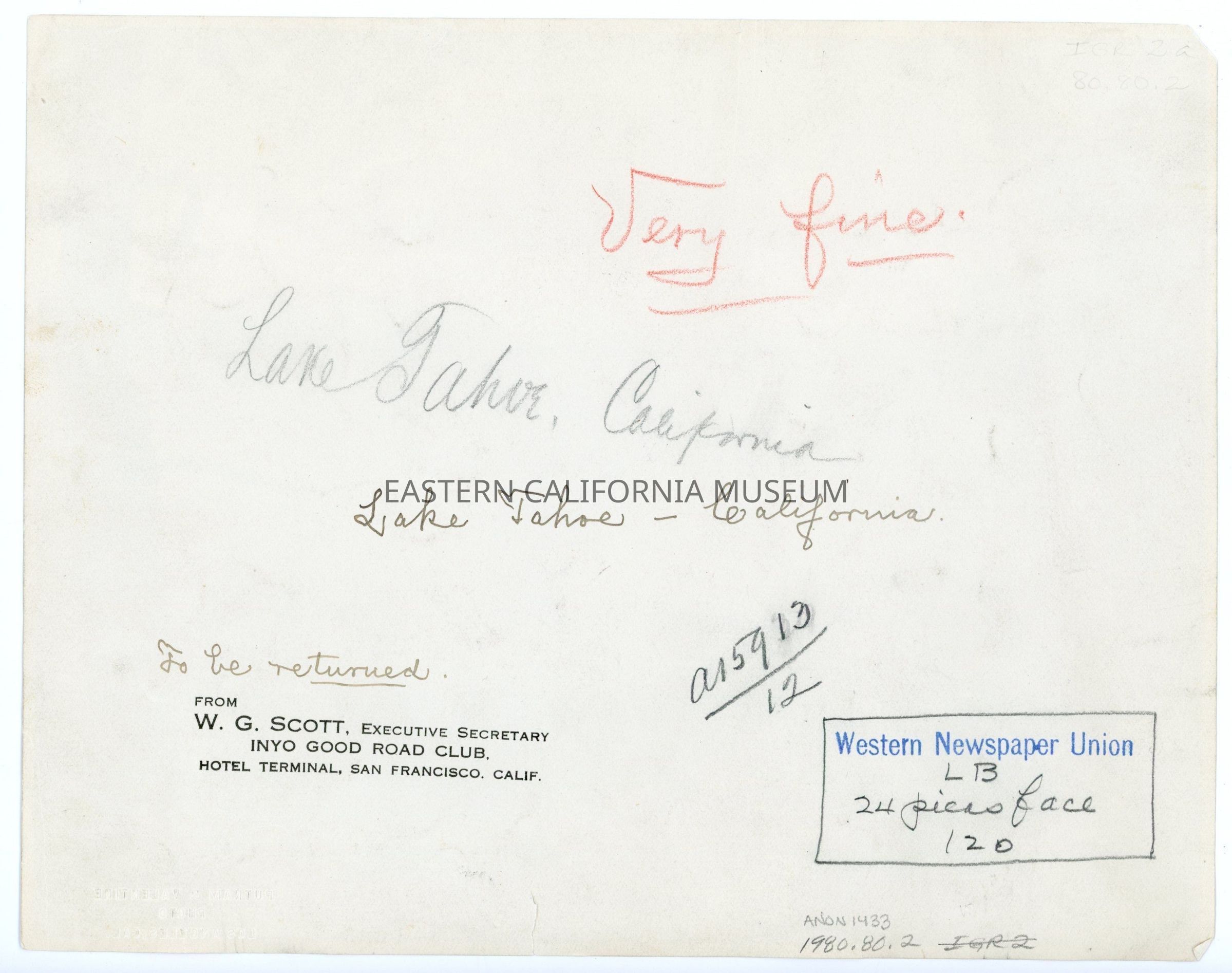 Stamped in black ink on reverse: From W. G. Scott, Executive Secretary, Inyo Good Road Club, Hotel Terminal, San Francisco, Calif.