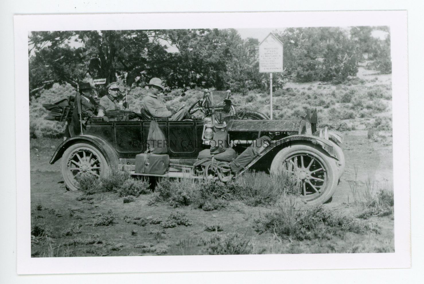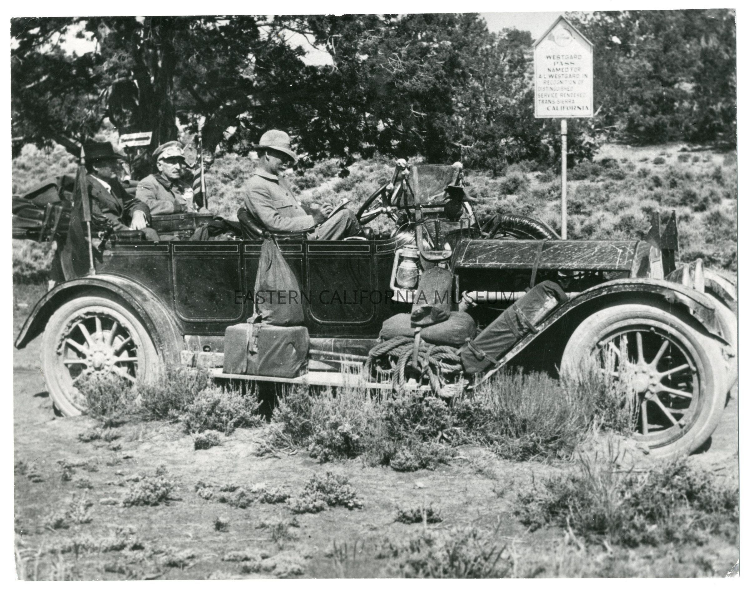 Photo of an automobile parked at the summit of Westgard Pass. There are three men in the car, and the man in the front seat appears to be writing something down. There are two signs behind the vehicle, one attached to a tree and is illegible, and the other is an Inyo Good Road Club sign that says, "Westgard Pass Named for A. L. Westgard in Recognition of Distinguished Service Rendered Trans-Sierra California."