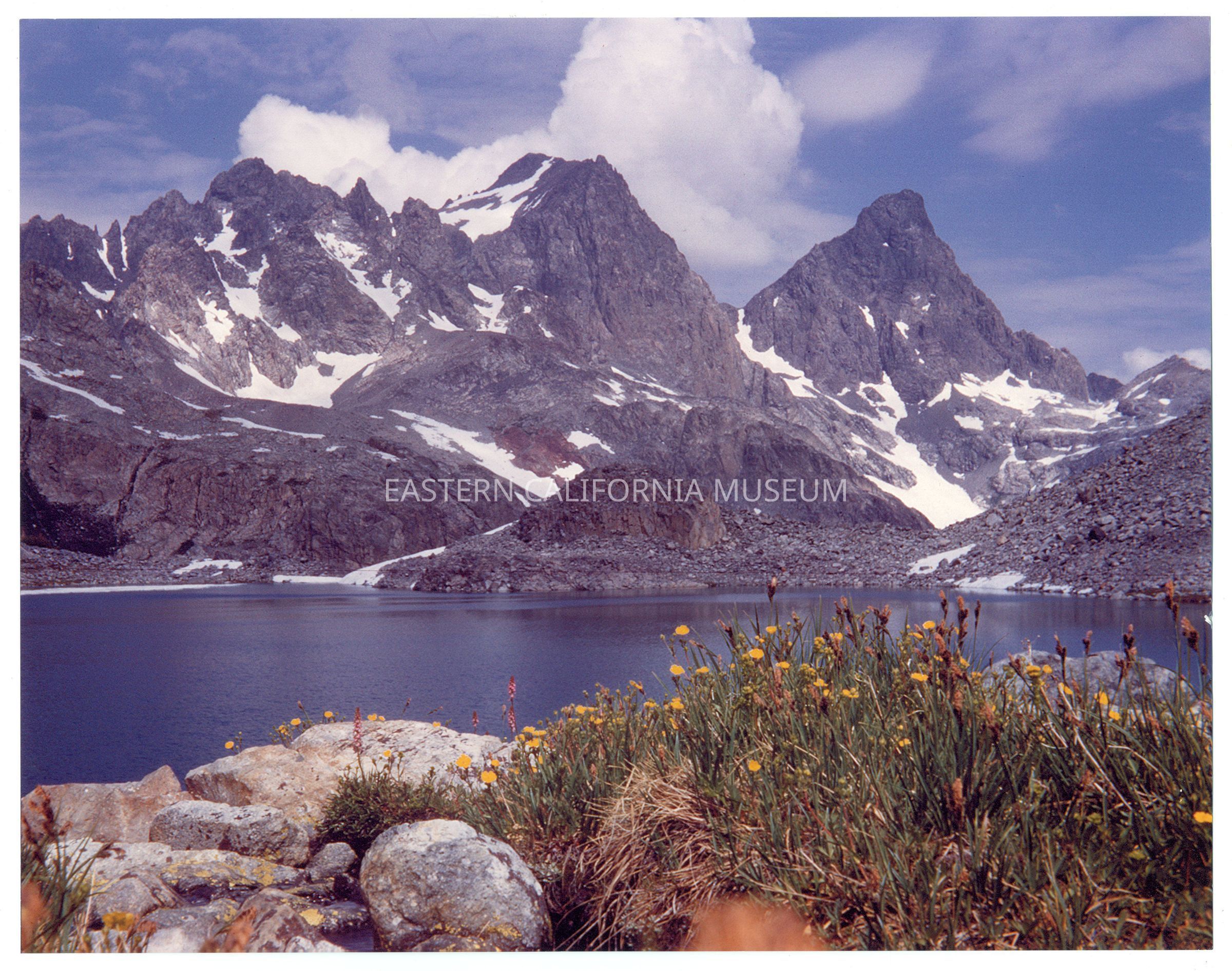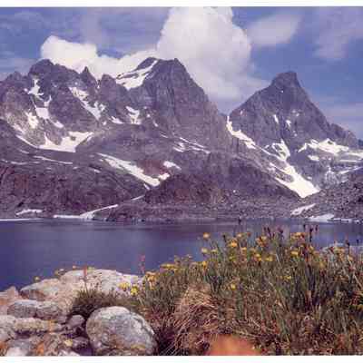 2010.22.27--Mountain landscape with lake and yellow wildflowers in foreground. Some patches of snow on mountains.