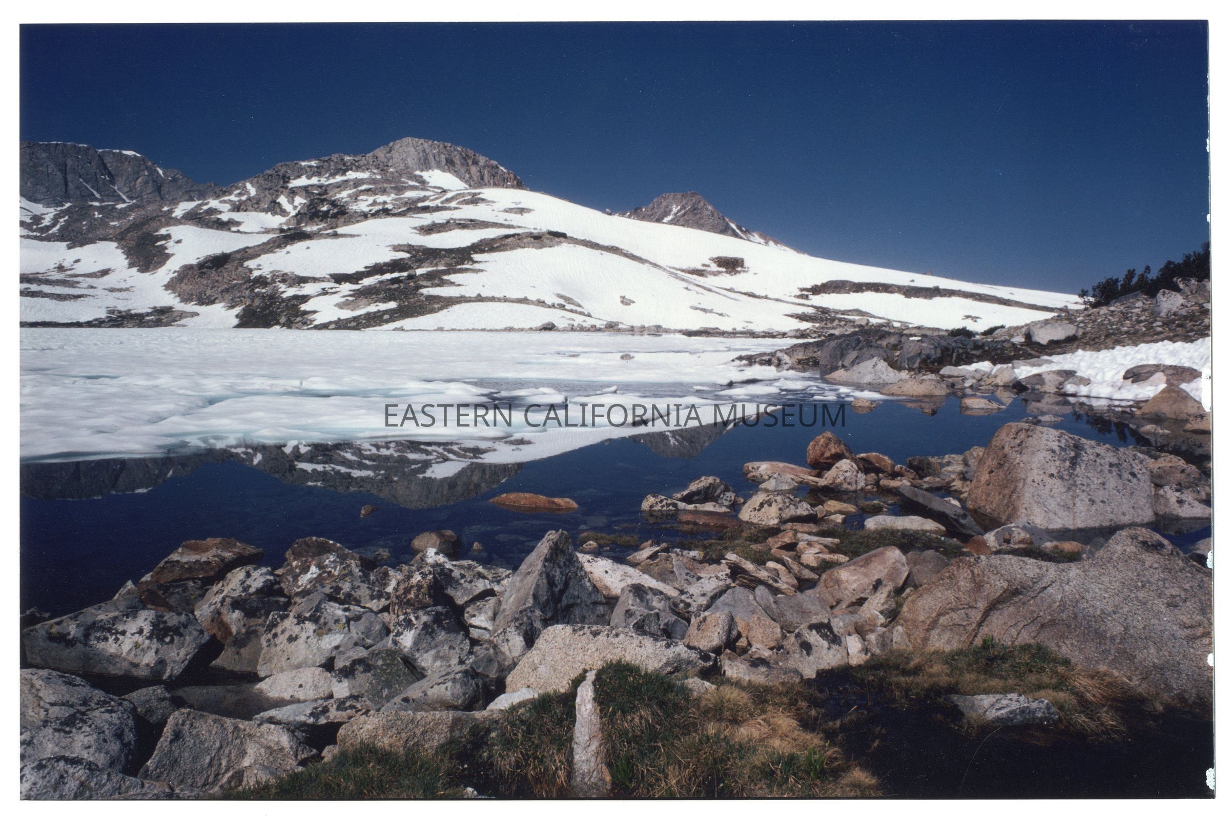 2010.22.25--Mountain landscape with peak reflecting in lake. Snow, boulders, clear sky.