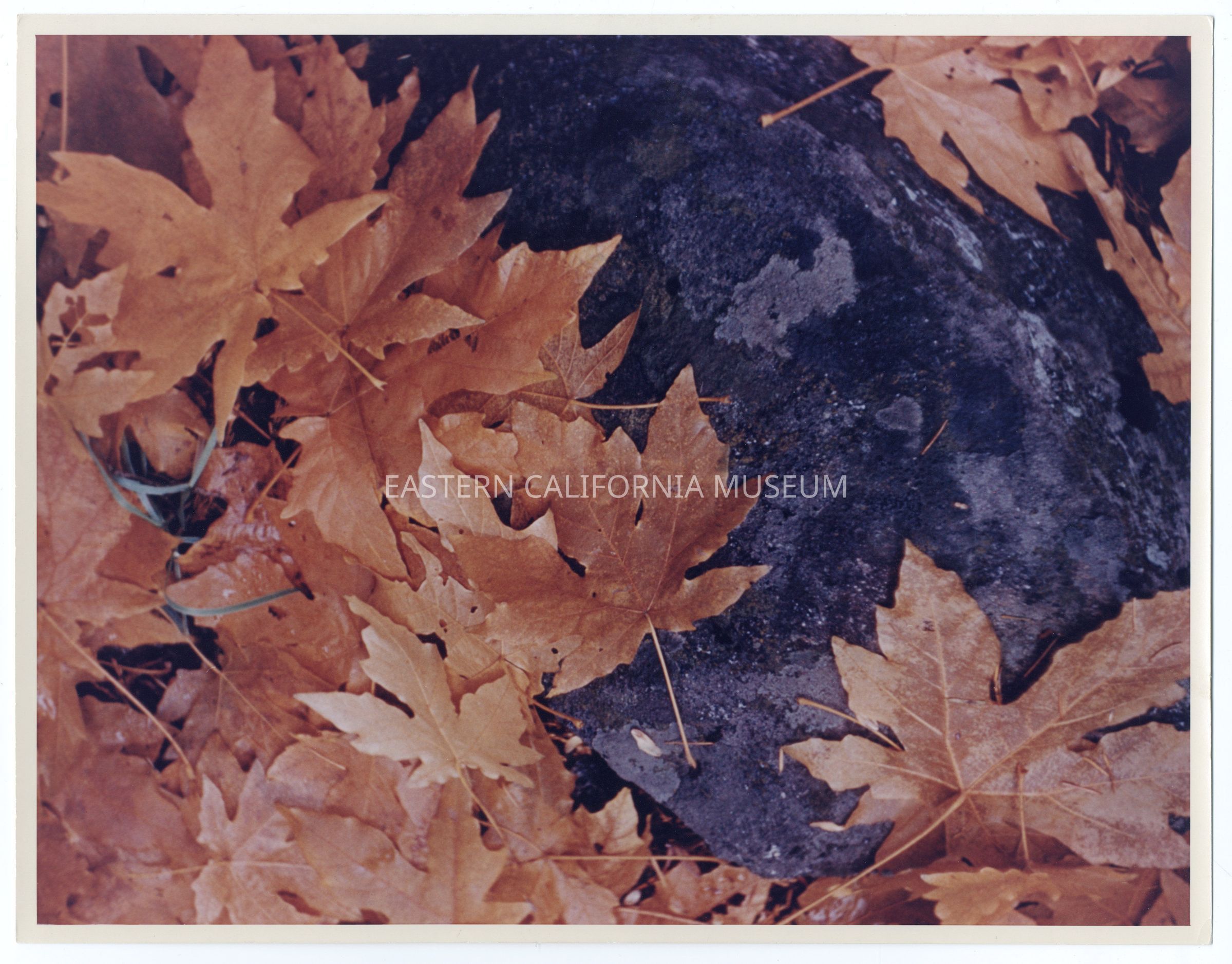 2010.22.26--Fallen autumn leaves on a boulder. Kodachrome enlargement made in January 1963.