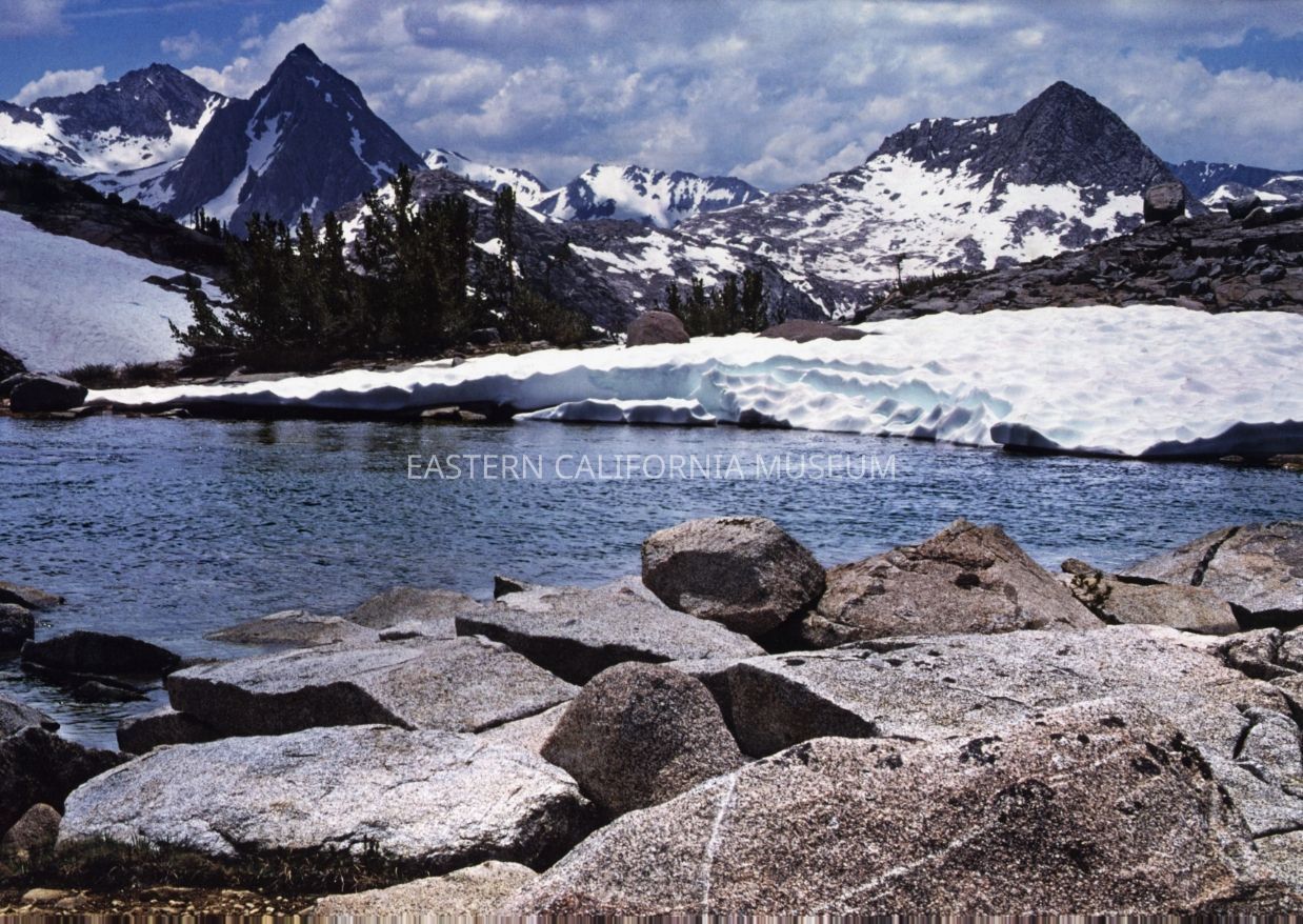 Color photo of a lake, snow, and mountain peaks taken by Bob Alan Rowe.