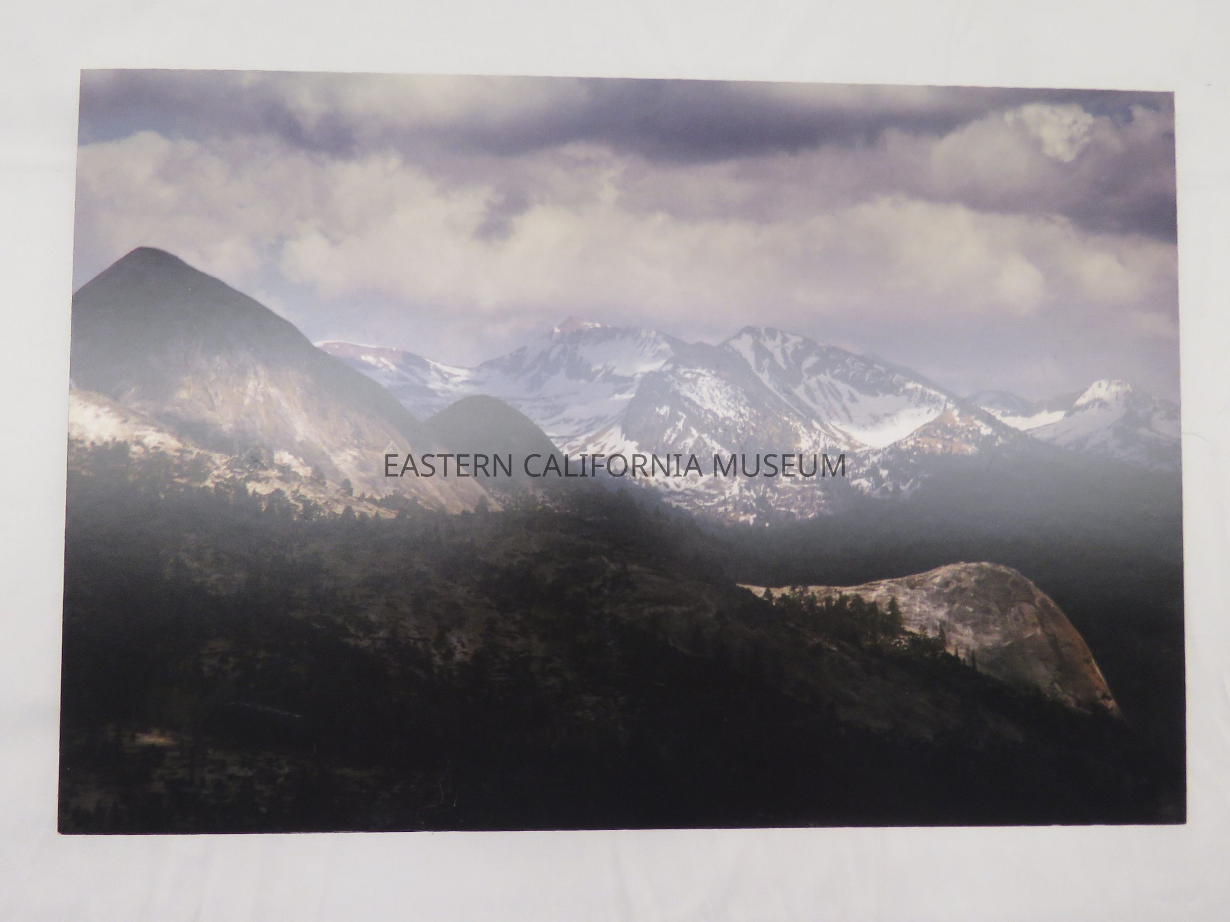 Color photo of a mountain landscape with forest in the foreground and snow-covered peaks in background. It was taken by Bob Alan Rowe.