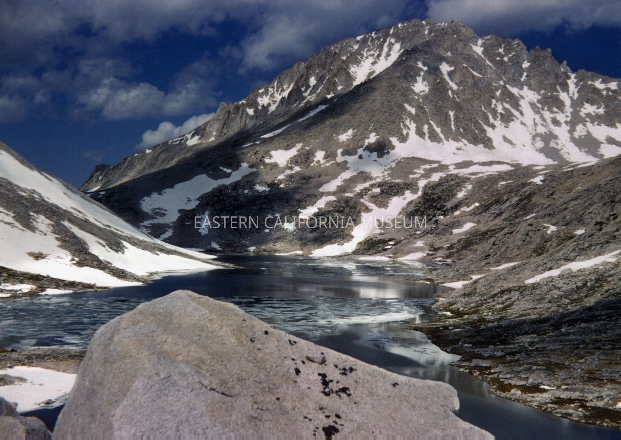 Color photo of a lake, snow, and mountain peak taken by Bob Alan Rowe.