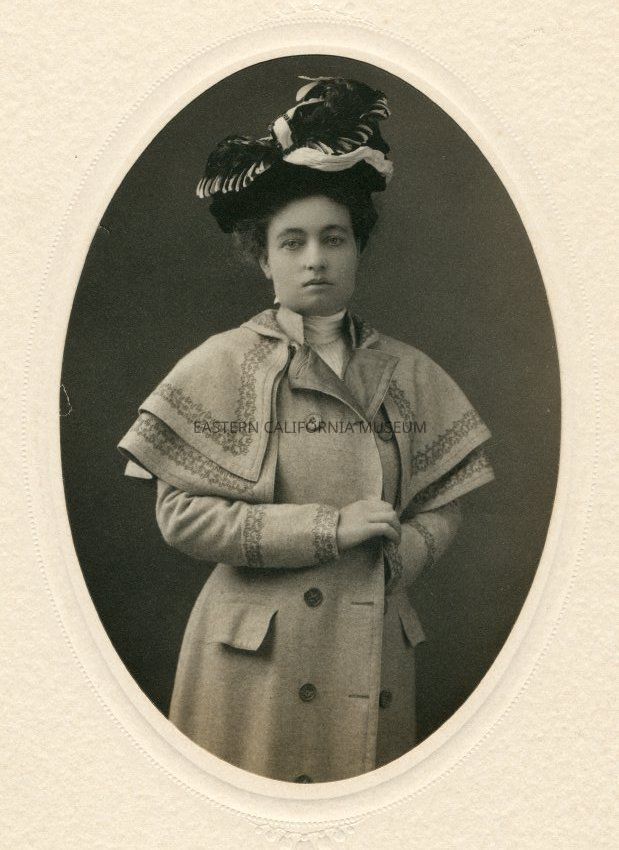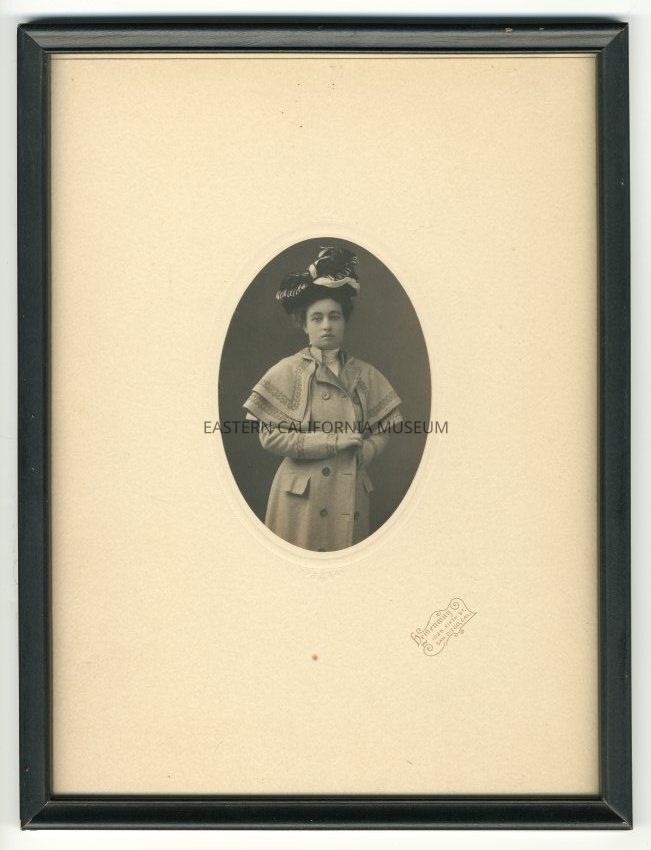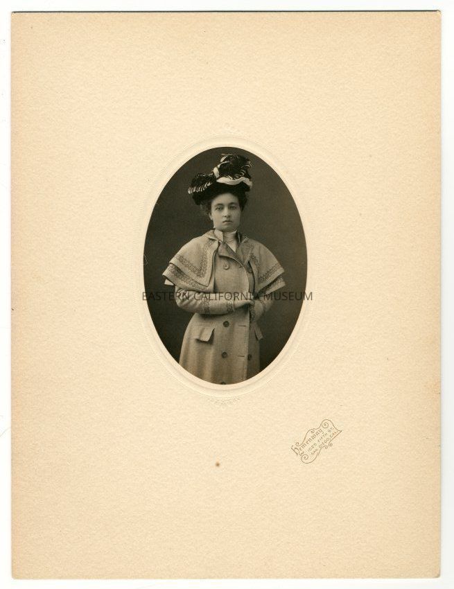 Mounted oval photograph of author Mary Austin, wearing a coat with cape at shoulders and an ornate headpiece (turban?). Photographed by Hemenway of San Diego.Collection