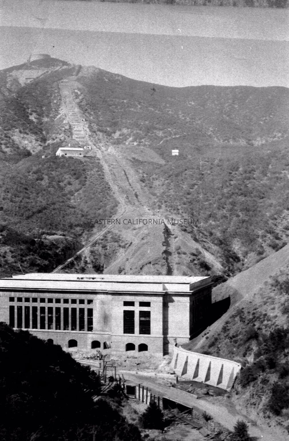 Photo of San Francisquito Power Plant Unit #1 under construction. The surge chamber is visible on the top of the hill in the top left of the image. Vegetation has been cleared and the pathway graded for the penstock, which has yet to be built.Collection