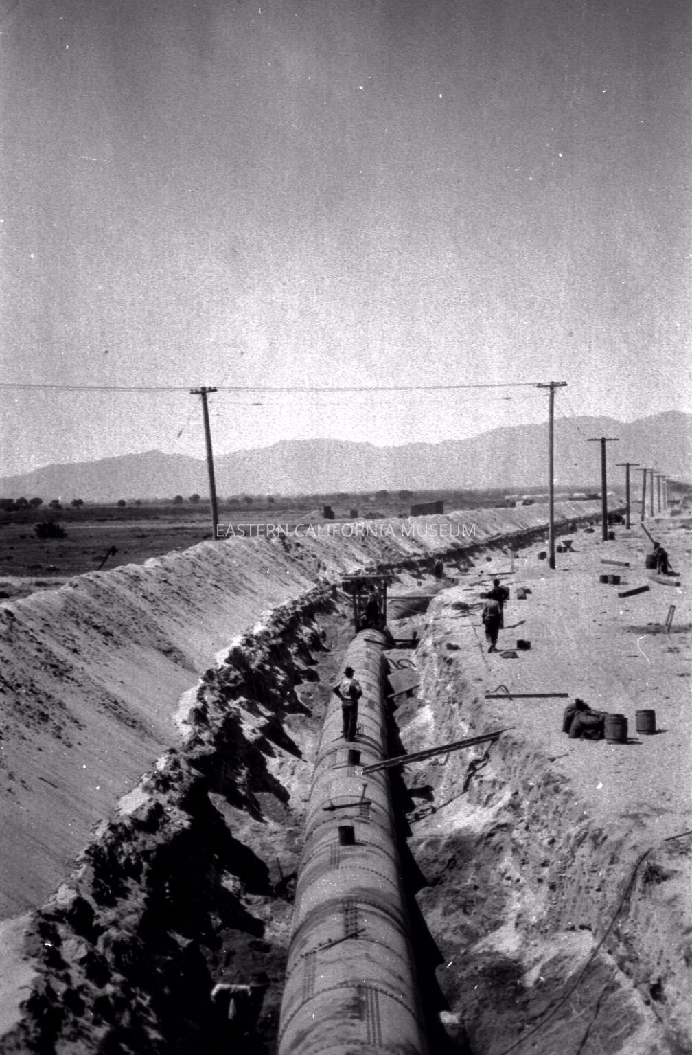 Photo of laborers constructing a section of siphon pipes in a channel for the aqueduct. Location may be Antelope Valley or the Mojave Desert. There are power lines running alongside the channel and also crossing it. Hills/mountains in the distance.Collection