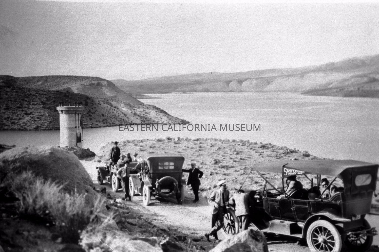 Photo of three early automobiles parked by a reservoir (maybe Bouquet Canyon?). The gate tower is visible on the left side of the image. One of the automobiles is sporting a pennant that says, "San Fernando Mission Lands."Collection