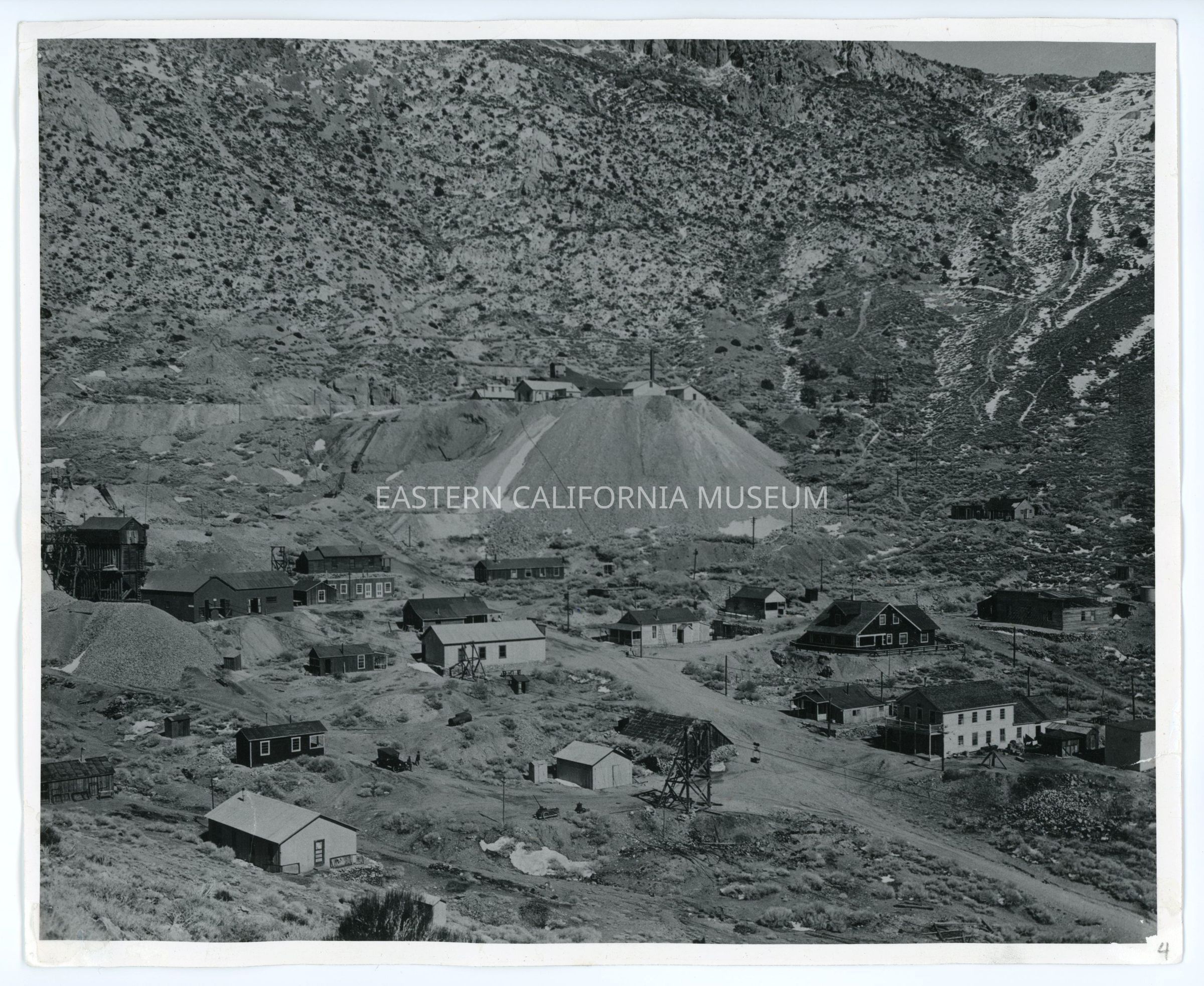 Photo of the mining town of Cerro Gordo. Large tailings dump in the center of the photo. The date the photo was taken in uncertain--maybe as early as 1916, or as late at the 1920s.