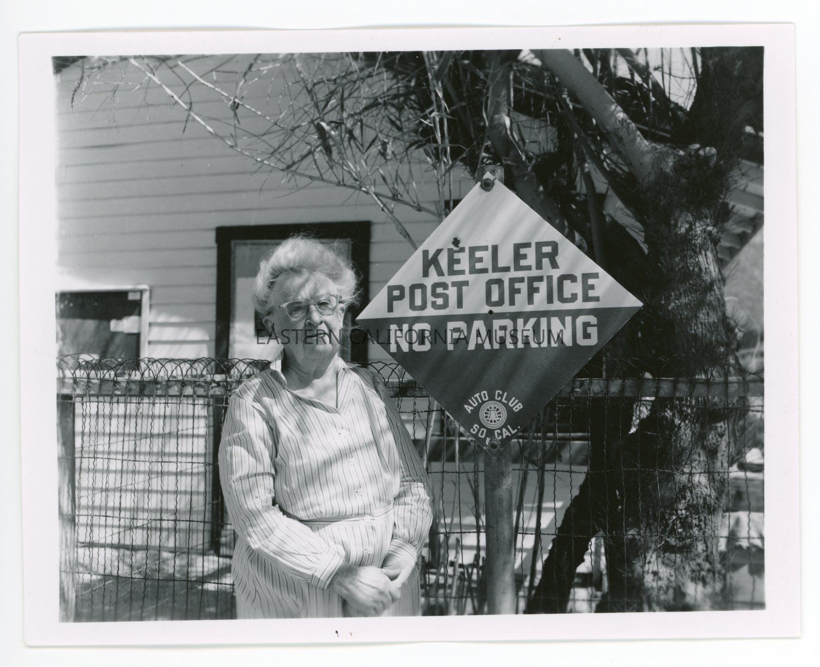 Photo of Lillian Hilderman, the Postmaster of Keeler Post Office, standing next to the "Keeler Post Office / No Parking" Automobile Club of Southern California sign. She became postmaster in 1919 and retired after 37 years and 8 months of public service in 1956.