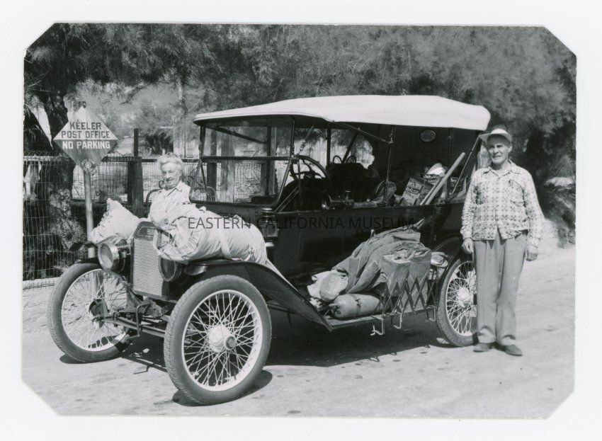 Small photo of Lillian Hilderman and L. T. Gotchy standing in front of the Keeler Post Office next to a packed Ford Model T. The accession paperwork says they are going camping.
