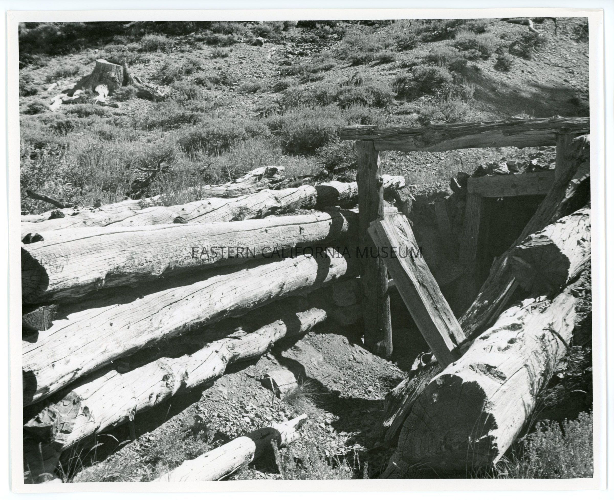 Photo of the Mexican Mine in the Bristlecone Pine Forest taken by David Hill in the early 1970s. It shows the entrance to a mine with retaining walls of logs.Collection