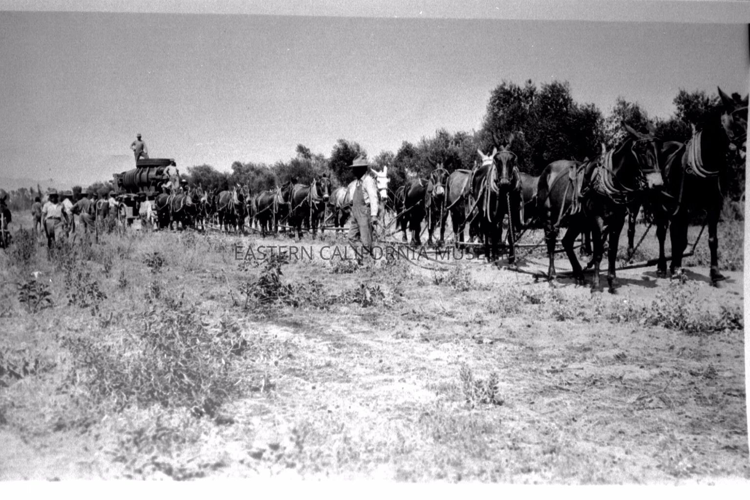 Photo of a massive mule team (between 20 and 52 mules) hauling machinery to be installed at the San Francisquito Power Plant. There are several laborers in the image, including one right in the center. This photo was taken at the same time and place as 2012.16.44.Collection