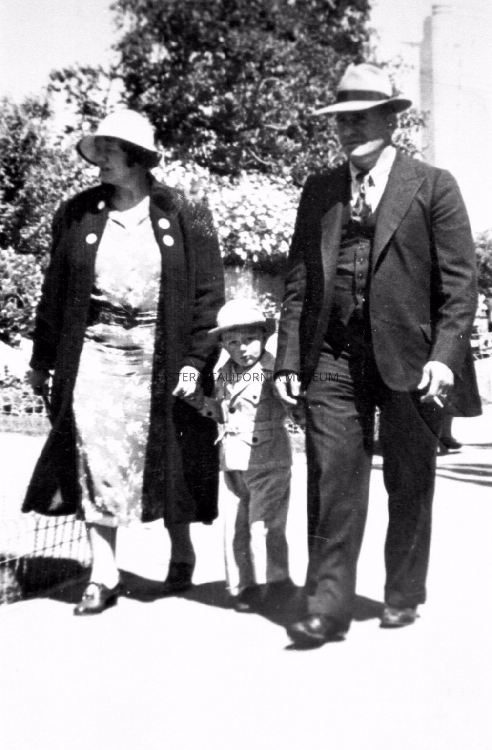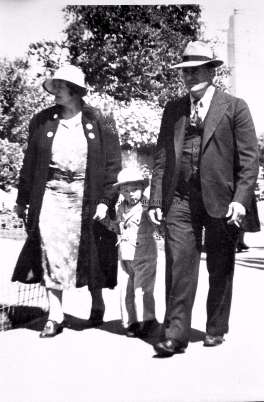Photo of a man and woman walking with a young boy between them. They are holding his hands. There are two scans of the same image.