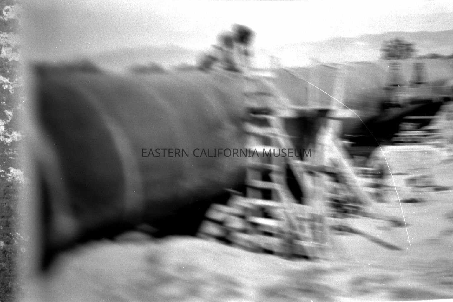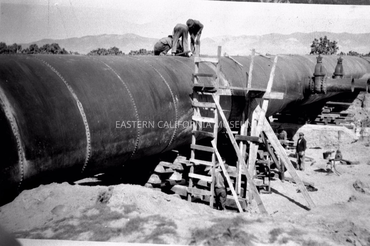 Photo of several laborers working on a siphon. There are three men on top of the siphon and more below. Two pressure release valves are visible at the far right. Location unknown, but possibly the Antelope Valley area.