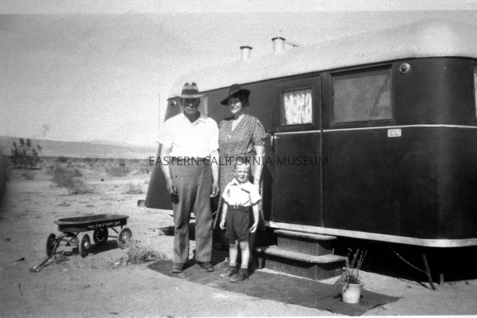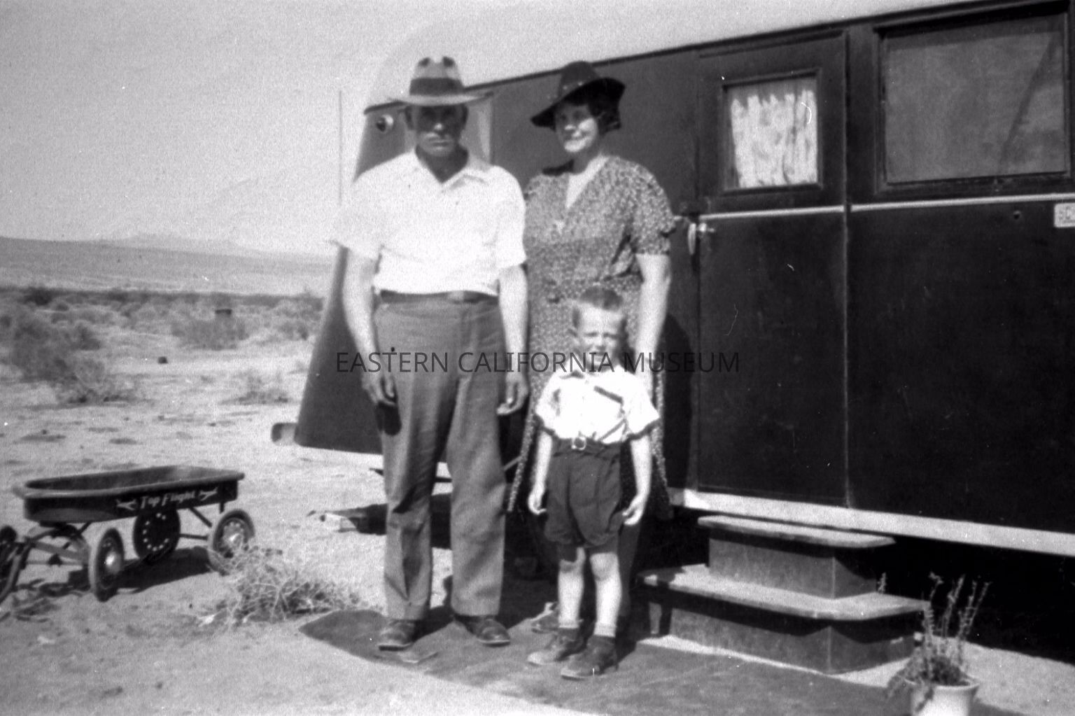 Photo of a man and woman with a young boy standing in front of a travel trailer. There is a metal "Top Flight" wagon next to them. They appear to be in the desert.
