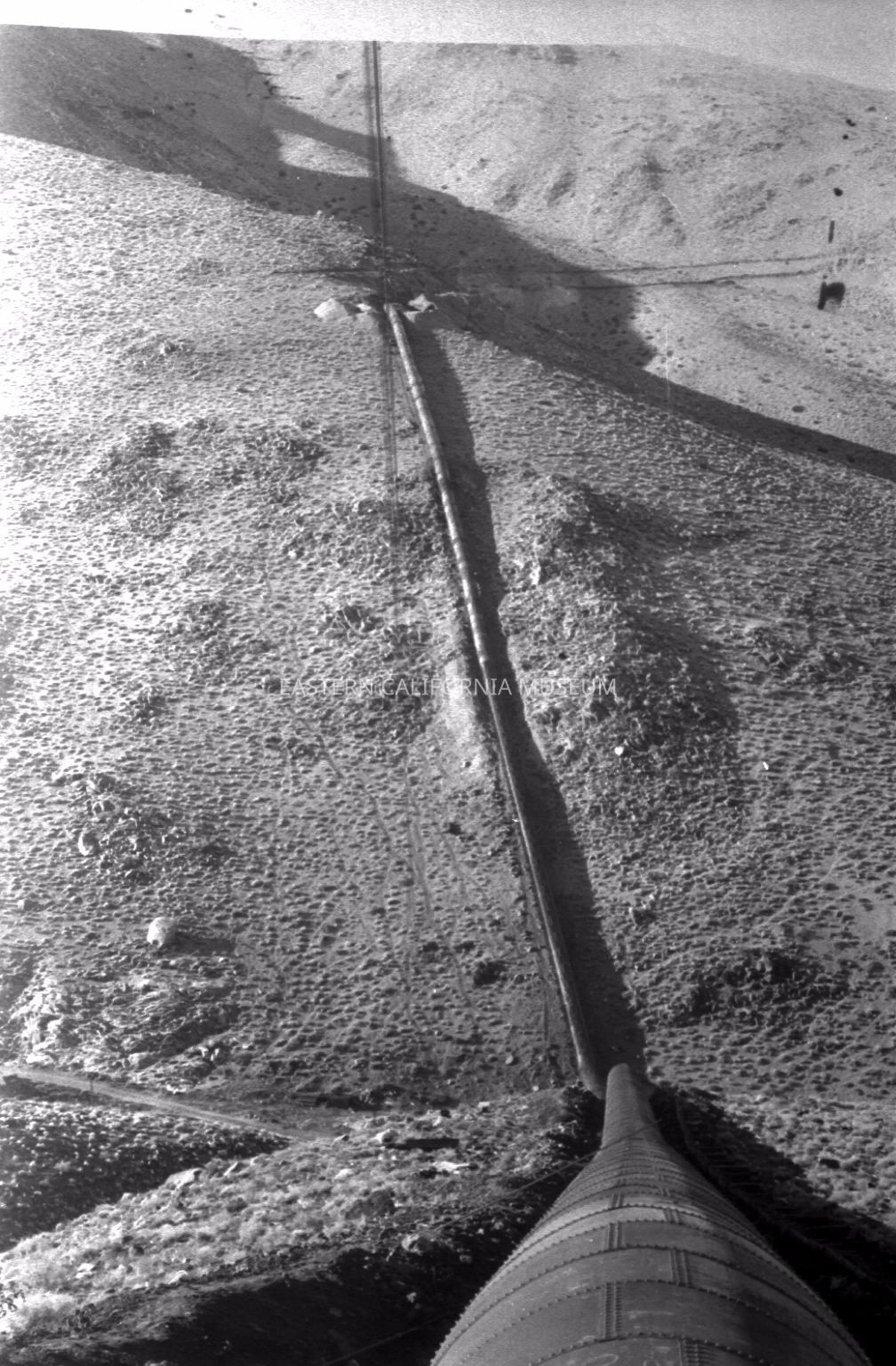 Photo taken looking nearly straight down at a (inverted?) siphon, which eventually ends in a tunnel on the opposite hillside. This photo was taken at the same place as 2012.16.62.