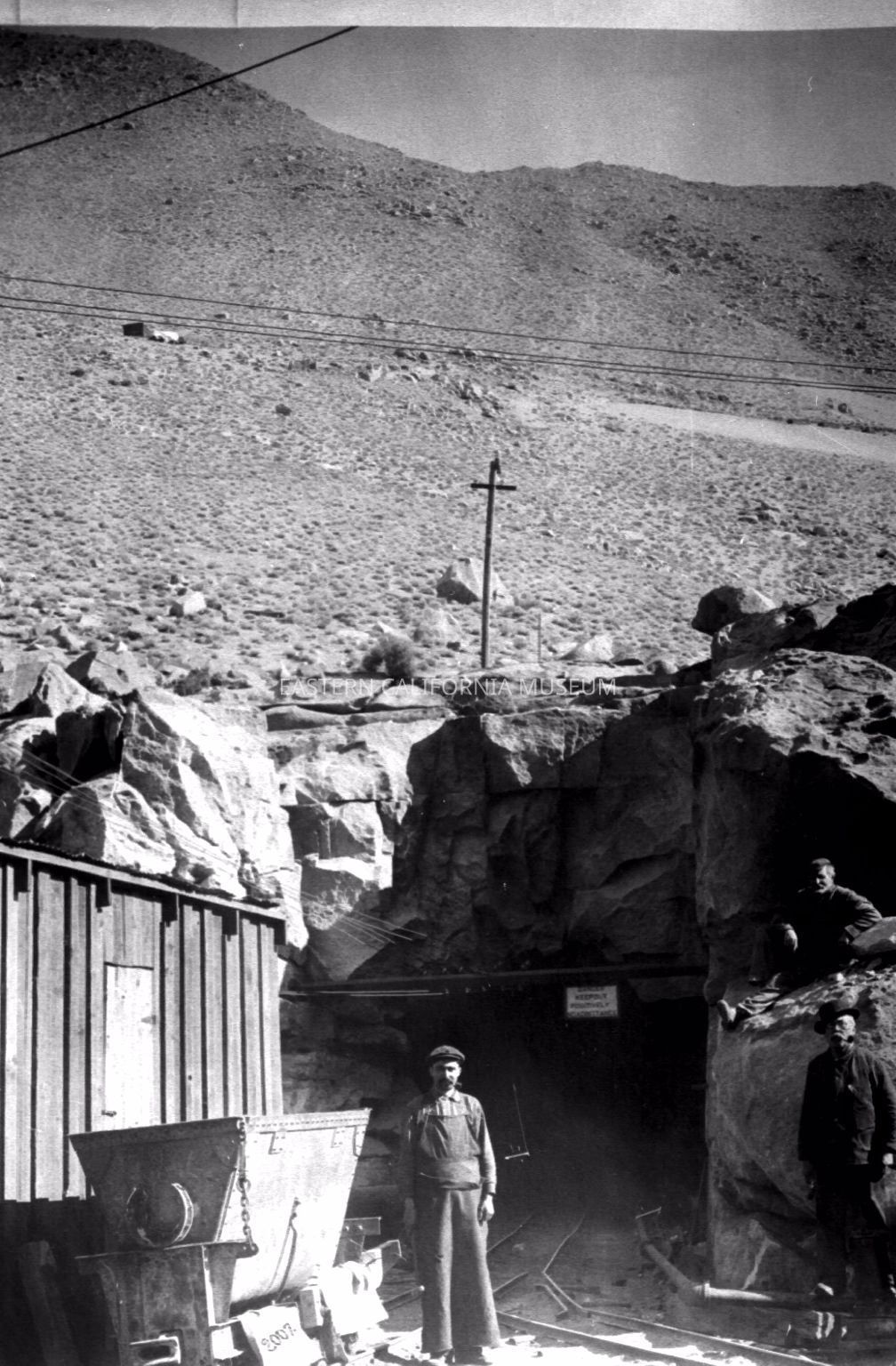 Photo of three laborers standing in front of an entrance to a tunnel. A sign hanging above the opening says, "Caution, keep out, positively no admittance." There is a wooden building on the left side and an ore cart. There is a pipe on the right wall of the tunnel--possibly for transporting water or compressed air for drills?
