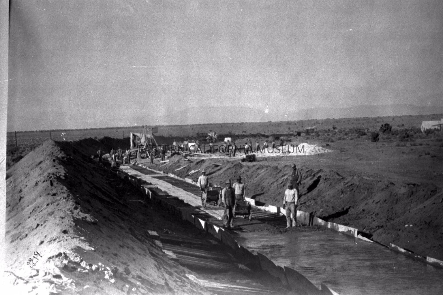 Photo of laborers using two wheeled carts to pour concrete along an excavated trench (dirt is piled up on left side). They may be prepping and putting a concrete roof on a covered conduit section of the aqueduct in the Antelope Valley.