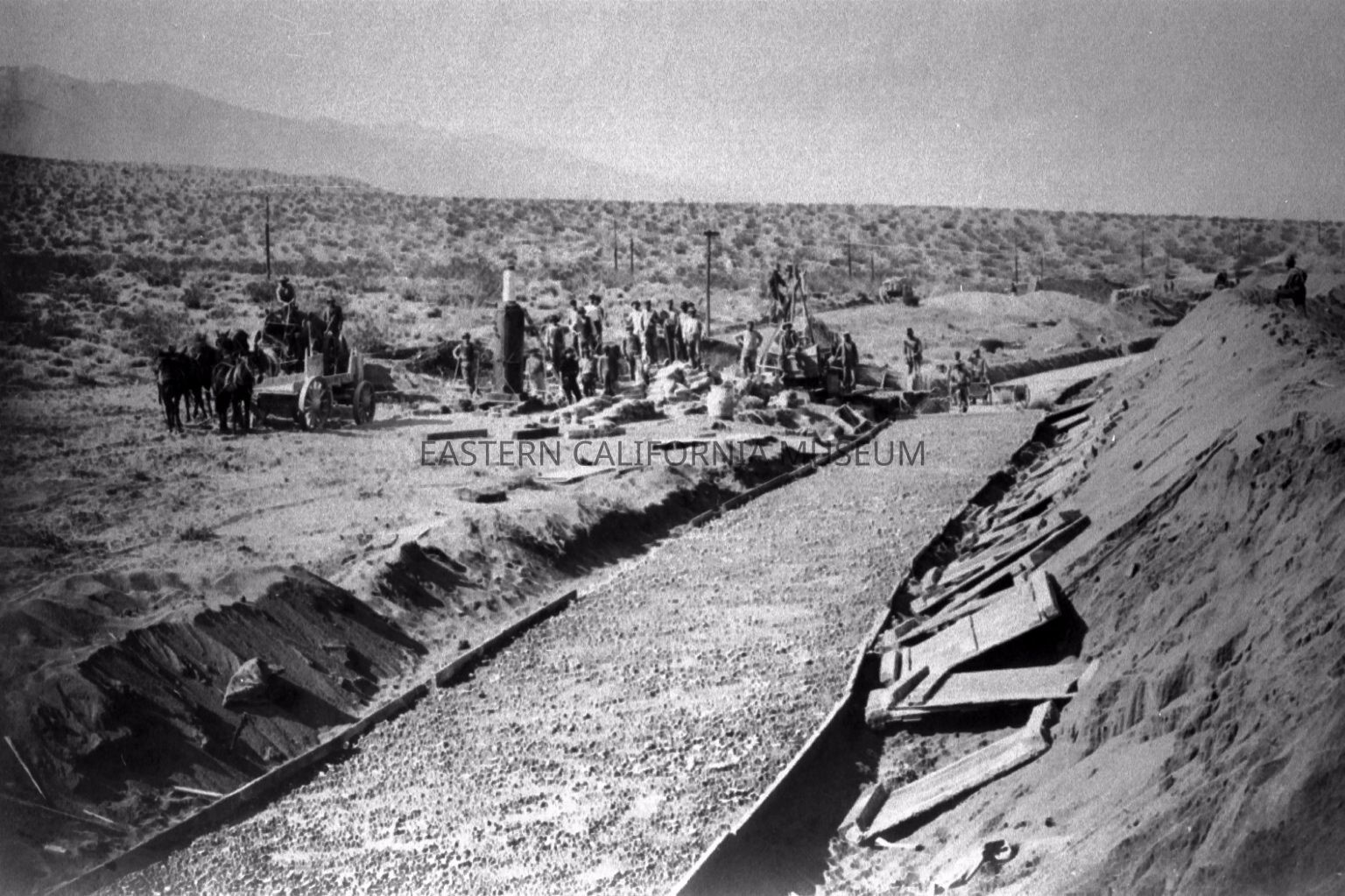 Photo of laborers posing for the photo next to a covered conduit section of the aqueduct, possibly in the Antelope Valley. There is a horse or mule drawn wagon on the left side.Collection