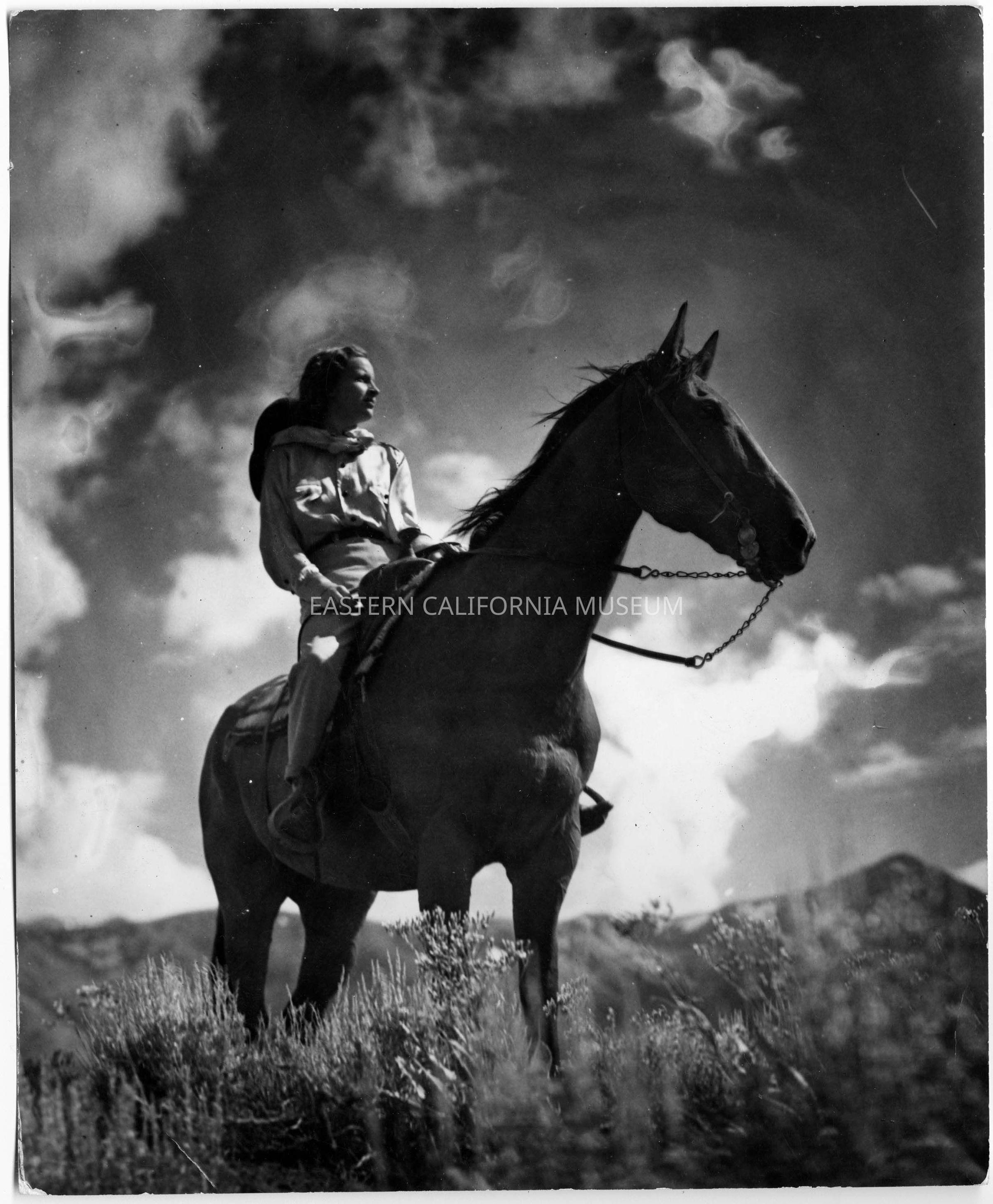 Photo of a woman on horseback who has been IDed by her daughter as Mrs. Curtis Phillips.