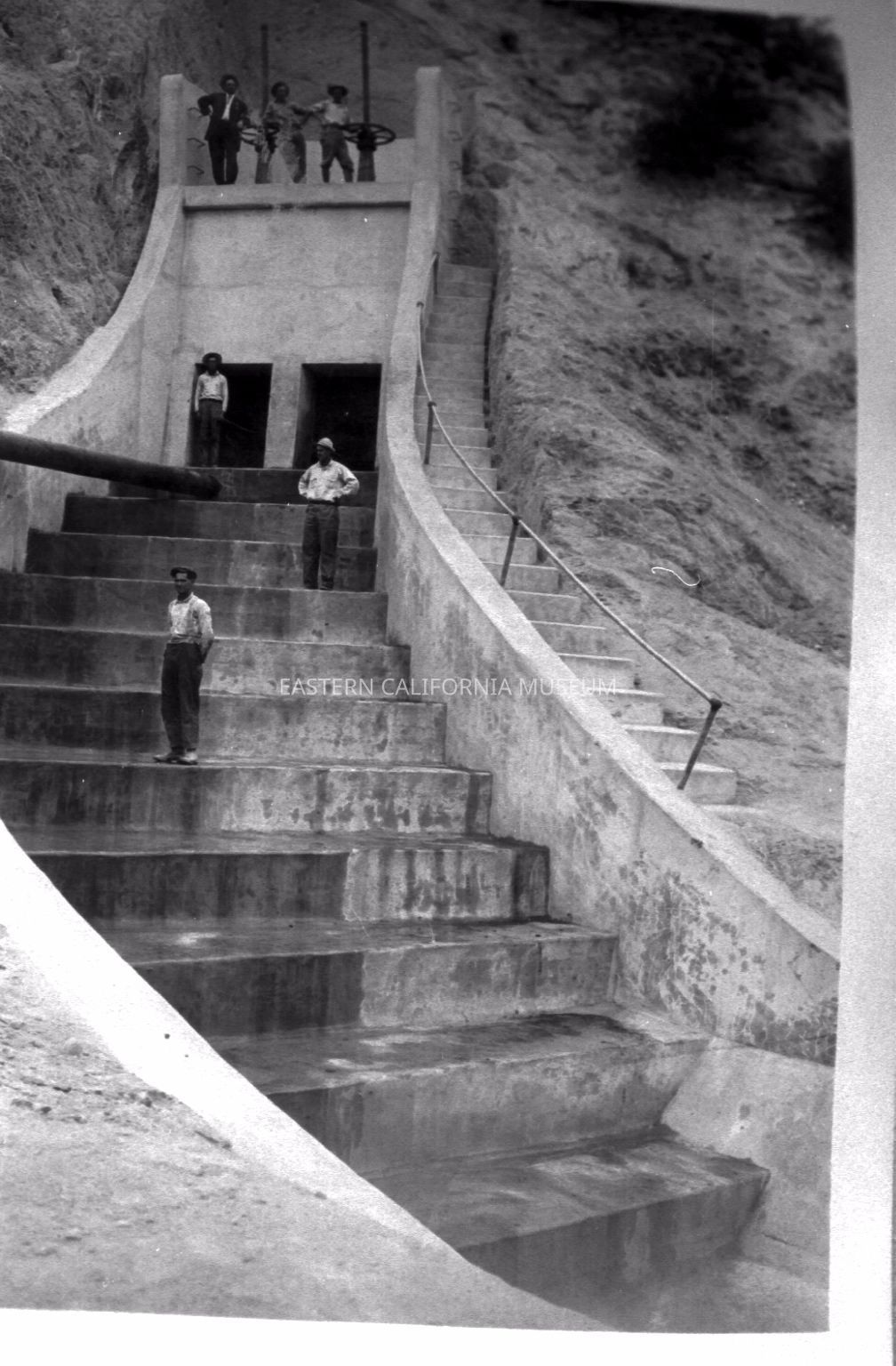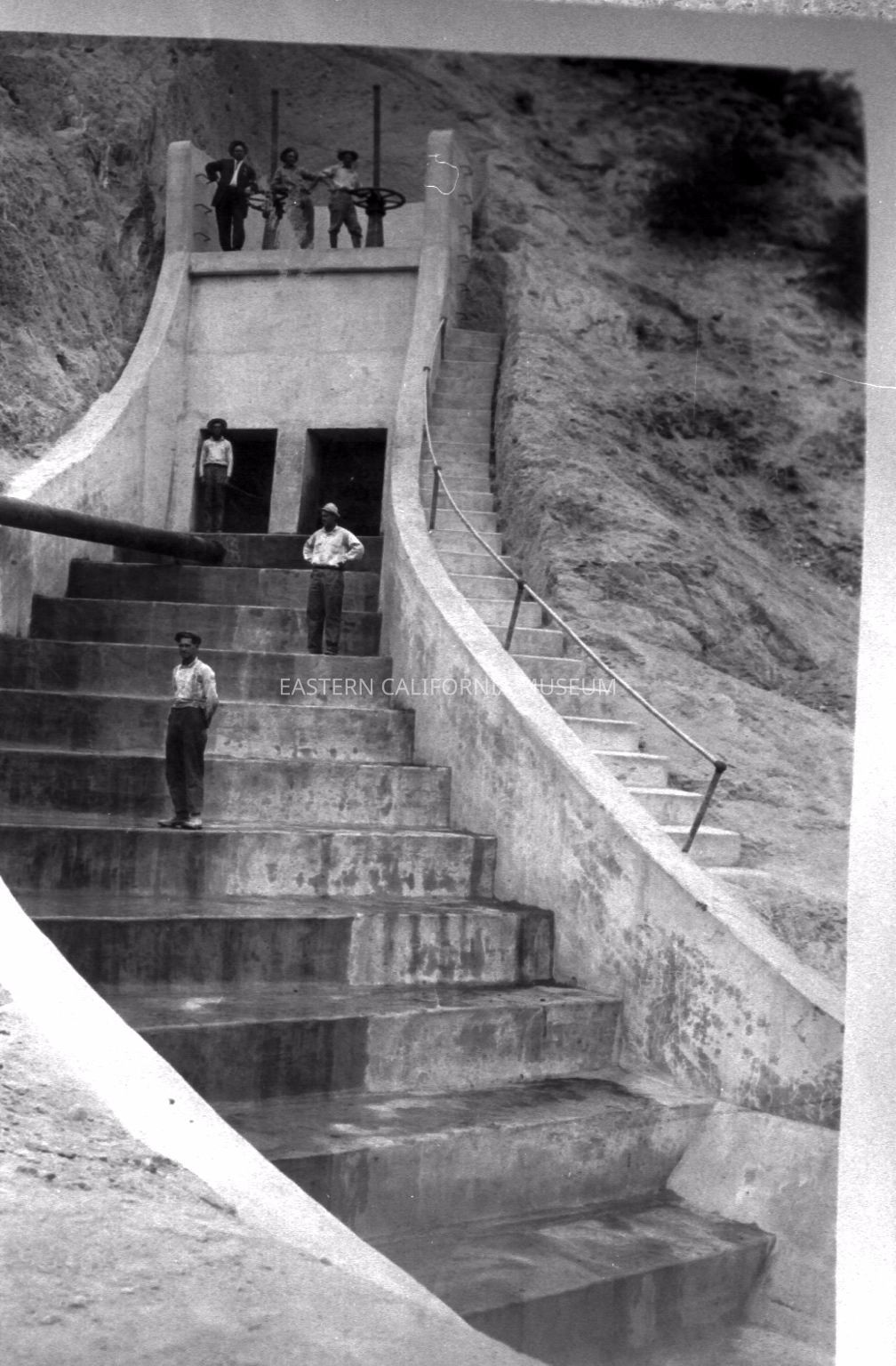 Photo of six men at the cascades. There are three men standing on top next to the control gates and the other three men are standing on the steps where water would typically be flowing. It appears that the steps are wet, possibly from a test run of the cascade gates that took place about three weeks before the aqueduct dedication ceremony.