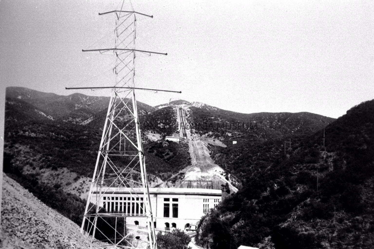 Photo of San Francisquito Power Plant Unit #1 generating hydroelectric power from the aqueduct. The penstock, dropping water into the plant, can be seen in the center of the photo. Unit #1 was placed in service on 03/18/1917 and energy was delivered to LA over a newly constructed 115kV transmission line. The 200 kilowatts generated by Unit 1 were the first commercial kilowatts generated by the Los Angeles Bureau of Power and Light (LABPL).Collection