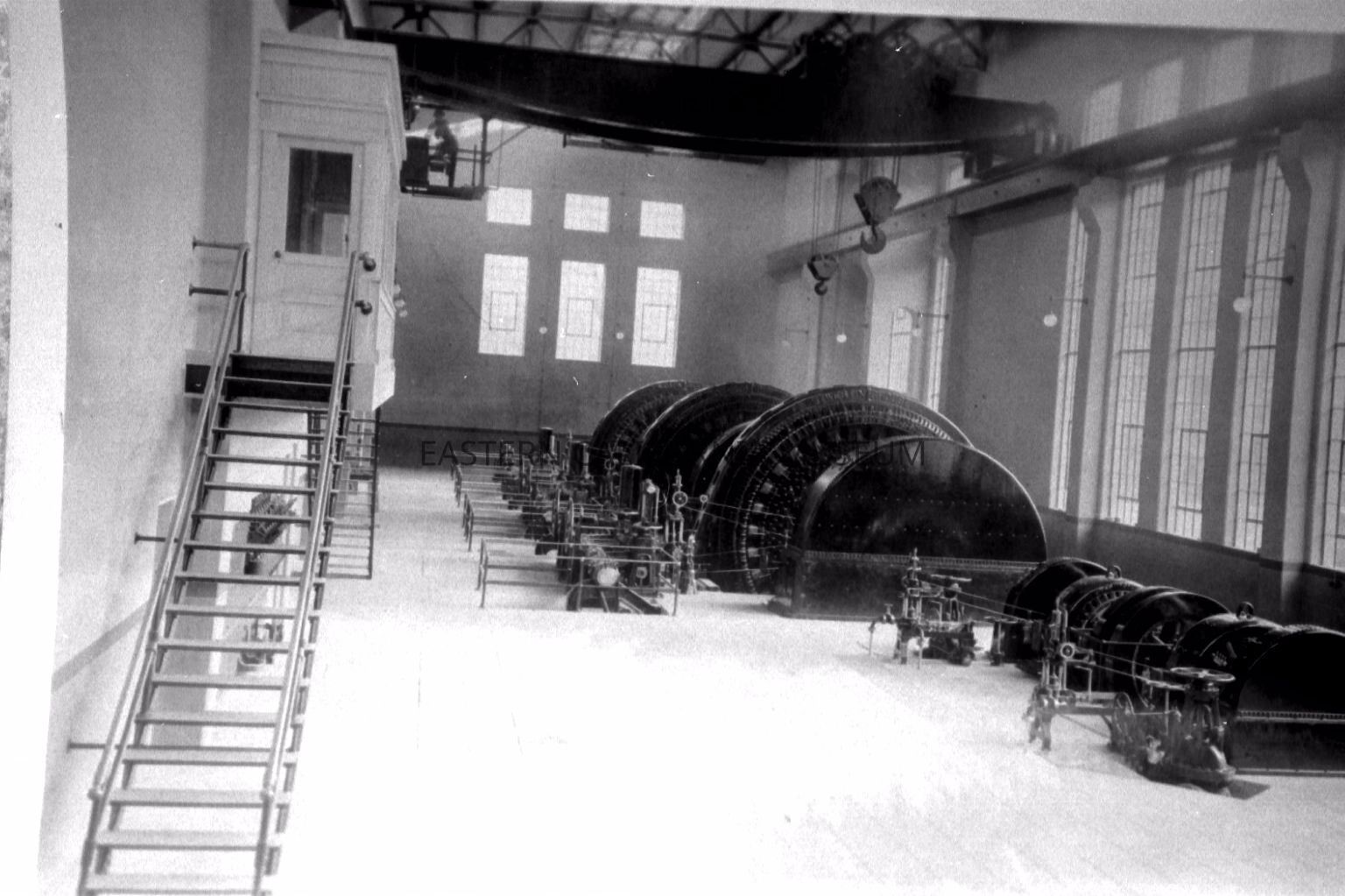Interior photo of San Francisquito Power Plant Unit #1 showing Pelton wheels and generators. Pelton wheels extracted energy from the impulse of moving water, as opposed to its weight, like a traditional overshot water wheel. Photo was taken pre 1924.Collection