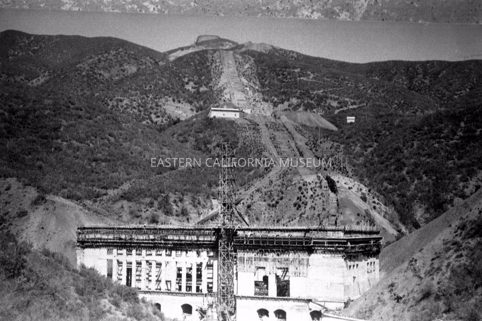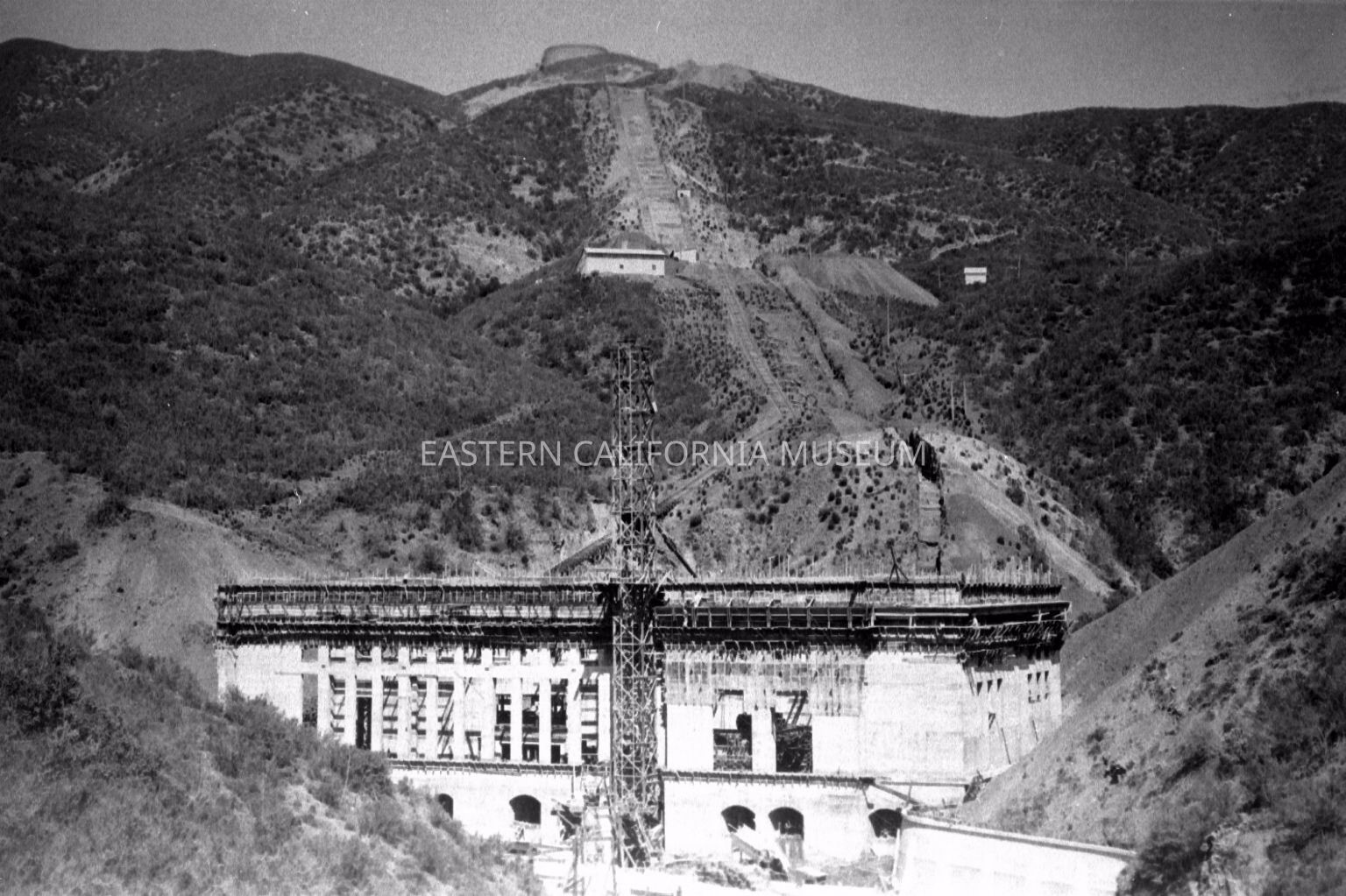Photo of San Francisquito Power Plant Unit #1 under construction. Construction began in 1911 and was completed by 1917, at which time the first power was transmitted to Los Angeles. The plant was built by the Bureau of Los Angeles Aqueduct Power, which was created to build hydroelectric power plants along the aqueduct. There were fourteen hydroelectric power plants built along the Los Angeles Aqueduct.