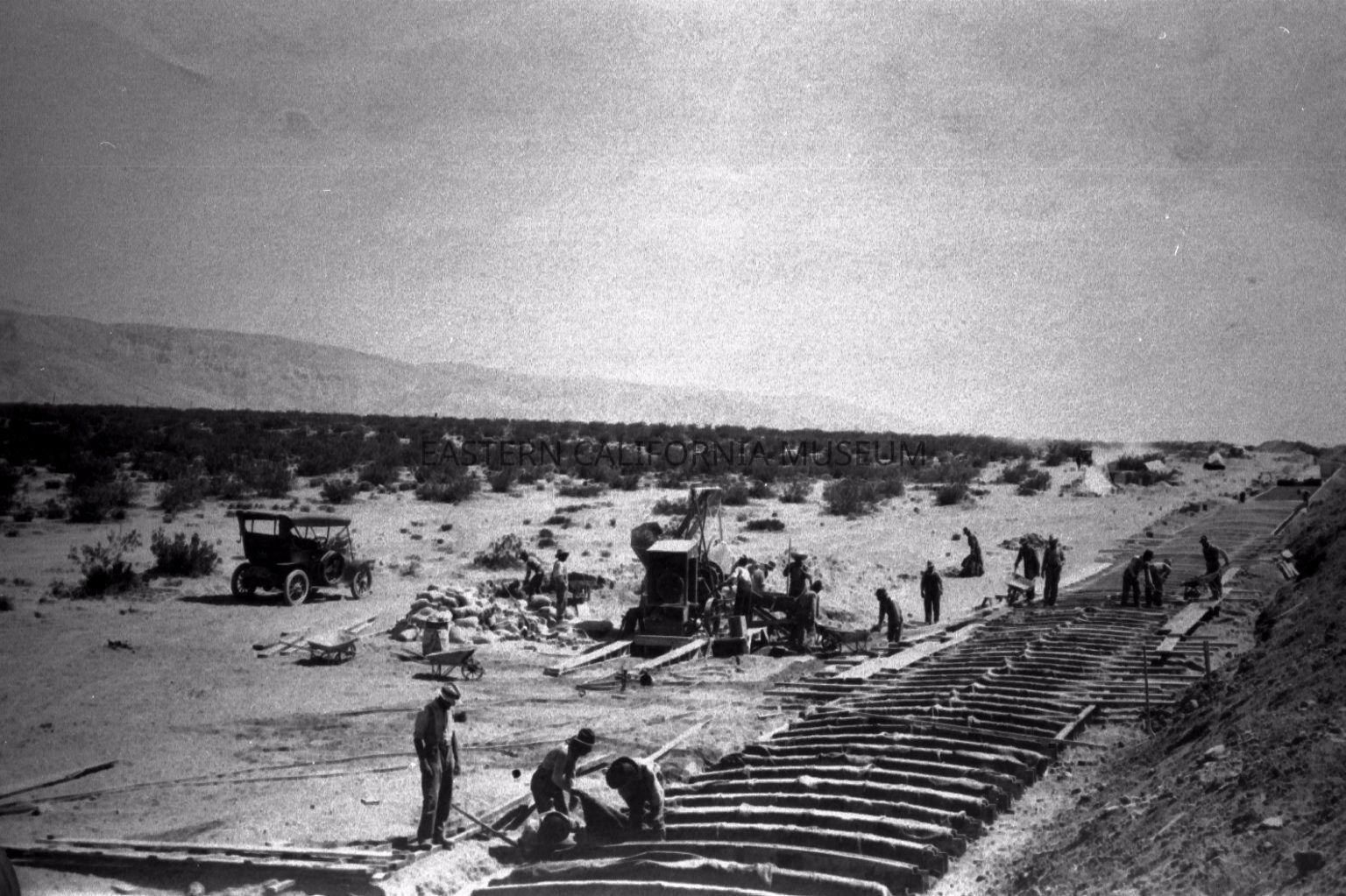 Photo of laborers working on the "ribs" of the covered conduit section of the aqueduct in the Mojave Desert. There is an early automobile in the background.
