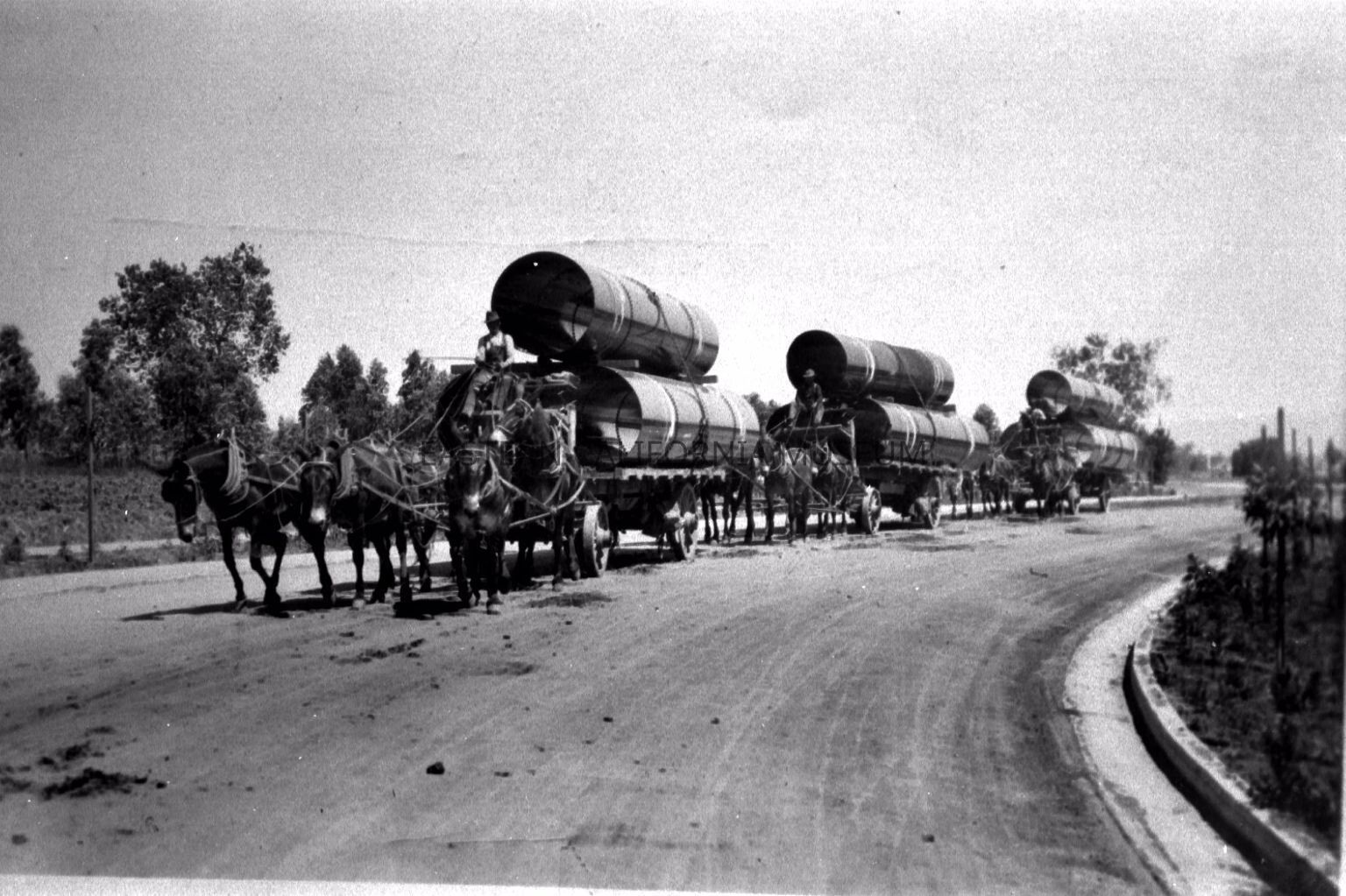 Photo of three mule-drawn wagons piled high with siphon pipes coming around a bend in the road. Location unknown.
