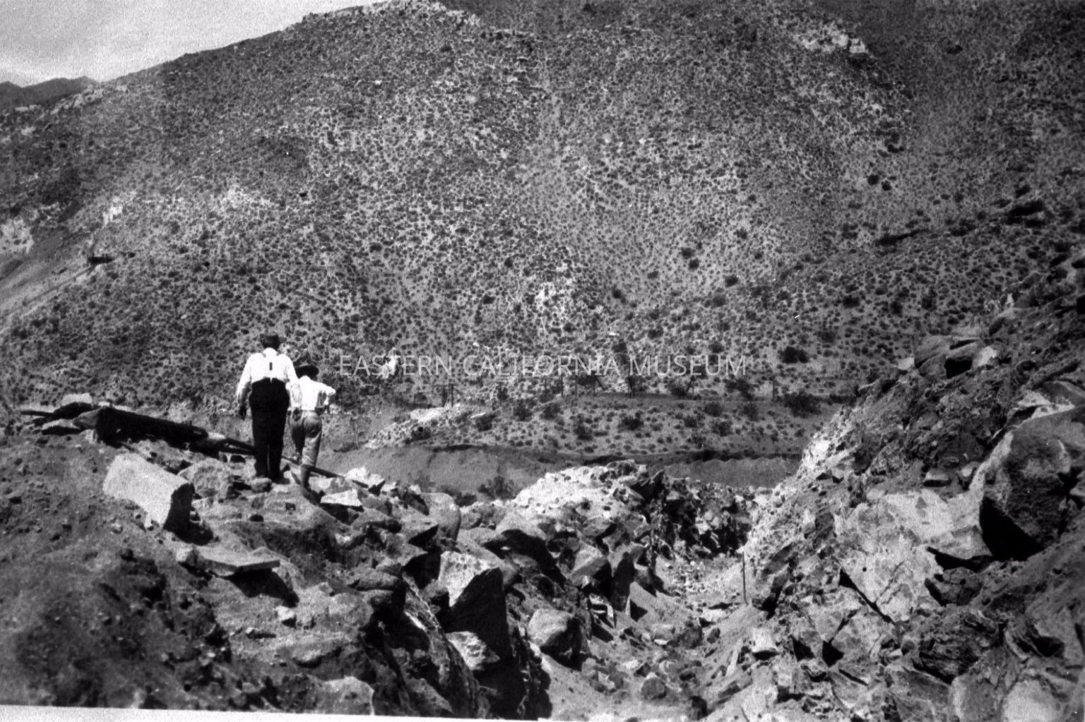 Photo of two people walking along a rough excavated trench (not yet a smooth channel). Could they be engineers or surveyors for the aqueduct? Location unknown, but maybe in the same region as 2012.16.36-37?Collection
