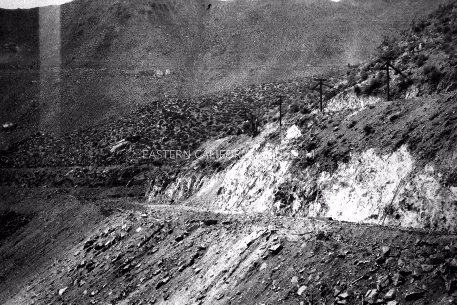 Photo of a road cut into a hillside. Location unknown. There are power/telegraph/telephone lines running along it higher up on the hill. This road was likely built or used during the construction of the aqueduct. Maybe the same region as 2012.16.37-38?Collection