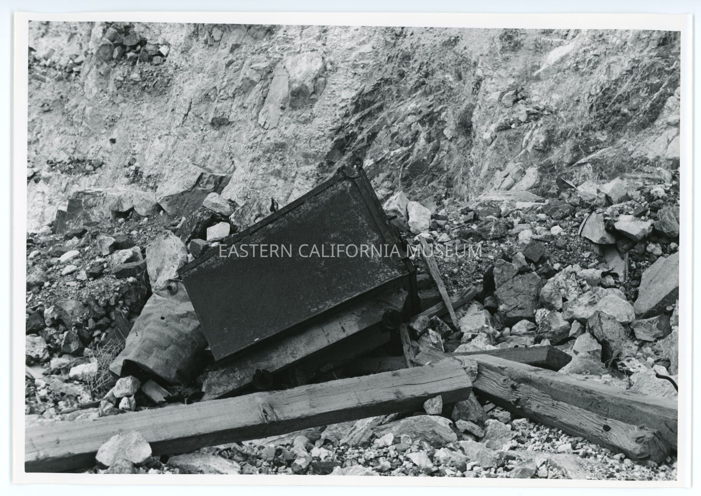 Photo of the Reward Mine taken by David Hill in January 1969. Shows an ore cart.Collection