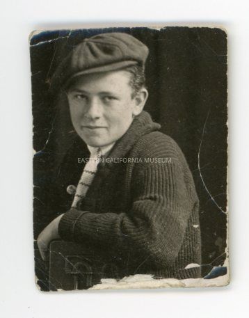 A small photo of a young man (student?) wearing a soft cap, knitted tie, and cardigan or sweater. He is seated on a chair and is twisting around to look at the camera.