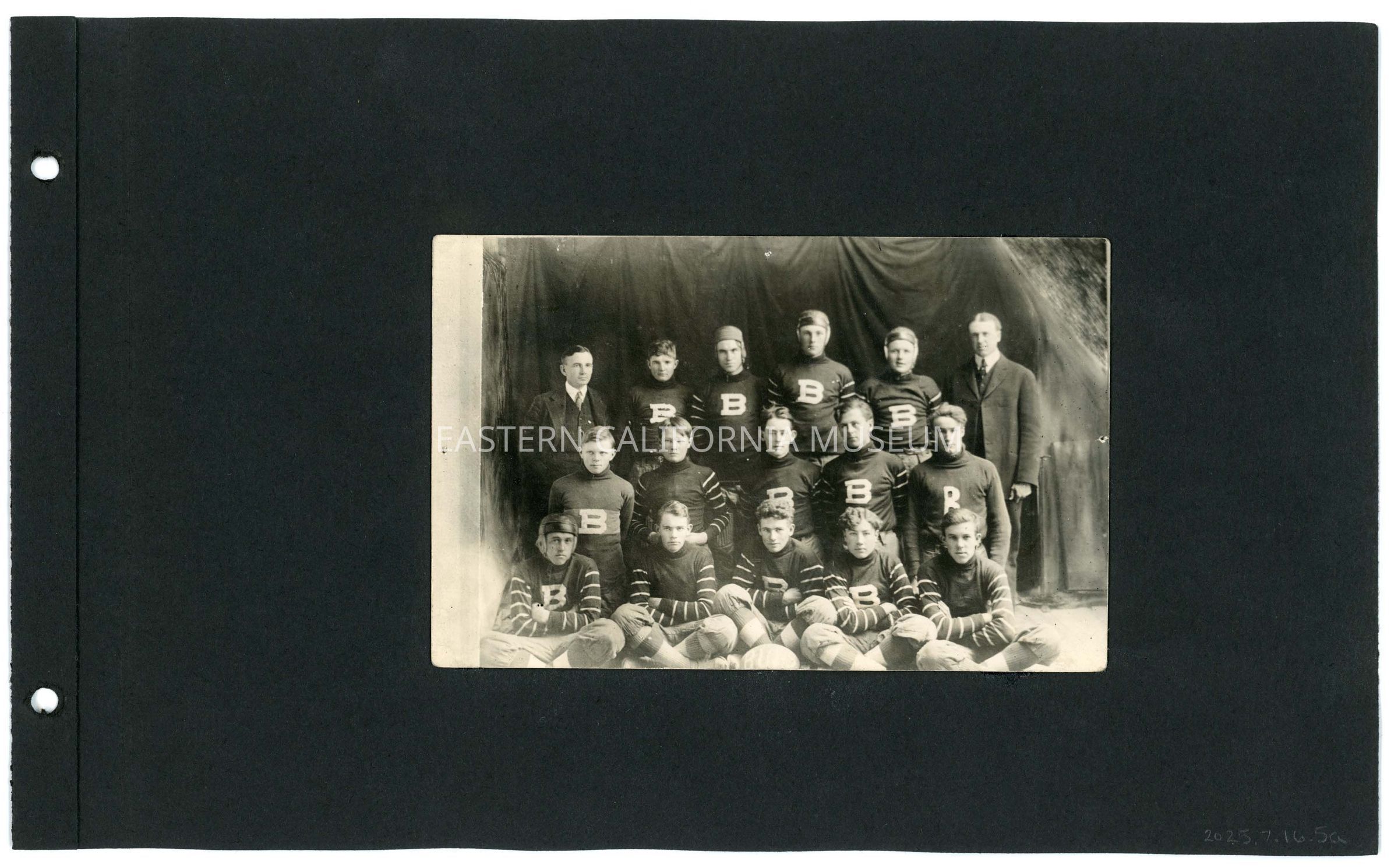 2025.7.16.5a--Photo of the BUHS (Bishop Union High School) football team, possibly taken for a yearbook. There are 14 student athletes and two adults (teachers or coaches?). Their uniform consists of a long-sleeved shirt with striped sleeves and a capital "B" on the chest.Photograph Details