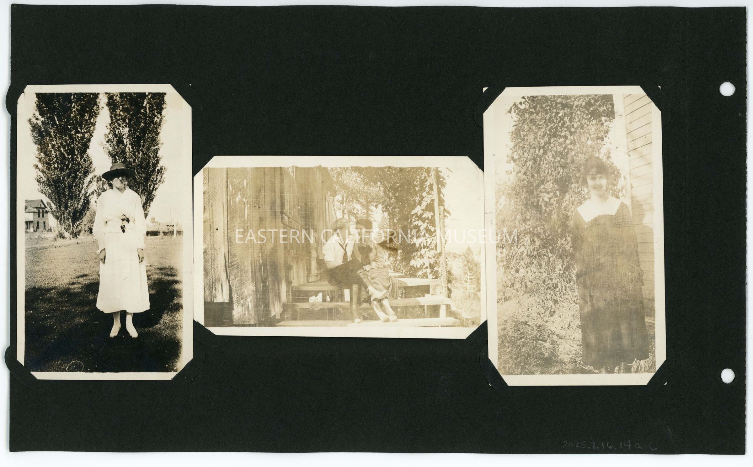 2025.7.16.14c--Photo of a young woman wearing a dark colored dress standing in front of a wall of shrubbery.Collection