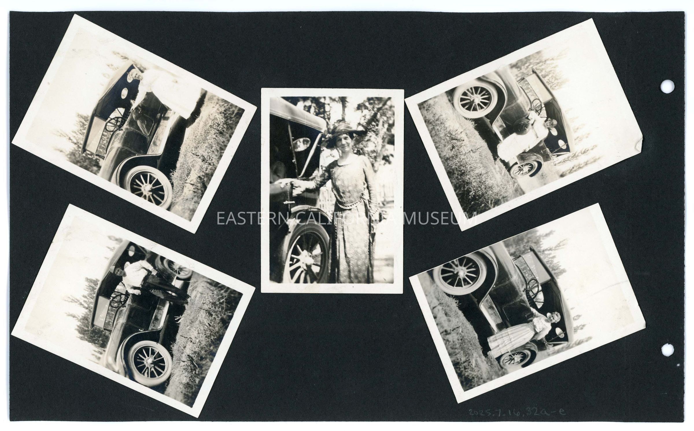 Collection of five photos of people posing with an automobile. Possibly the family's first automobile?