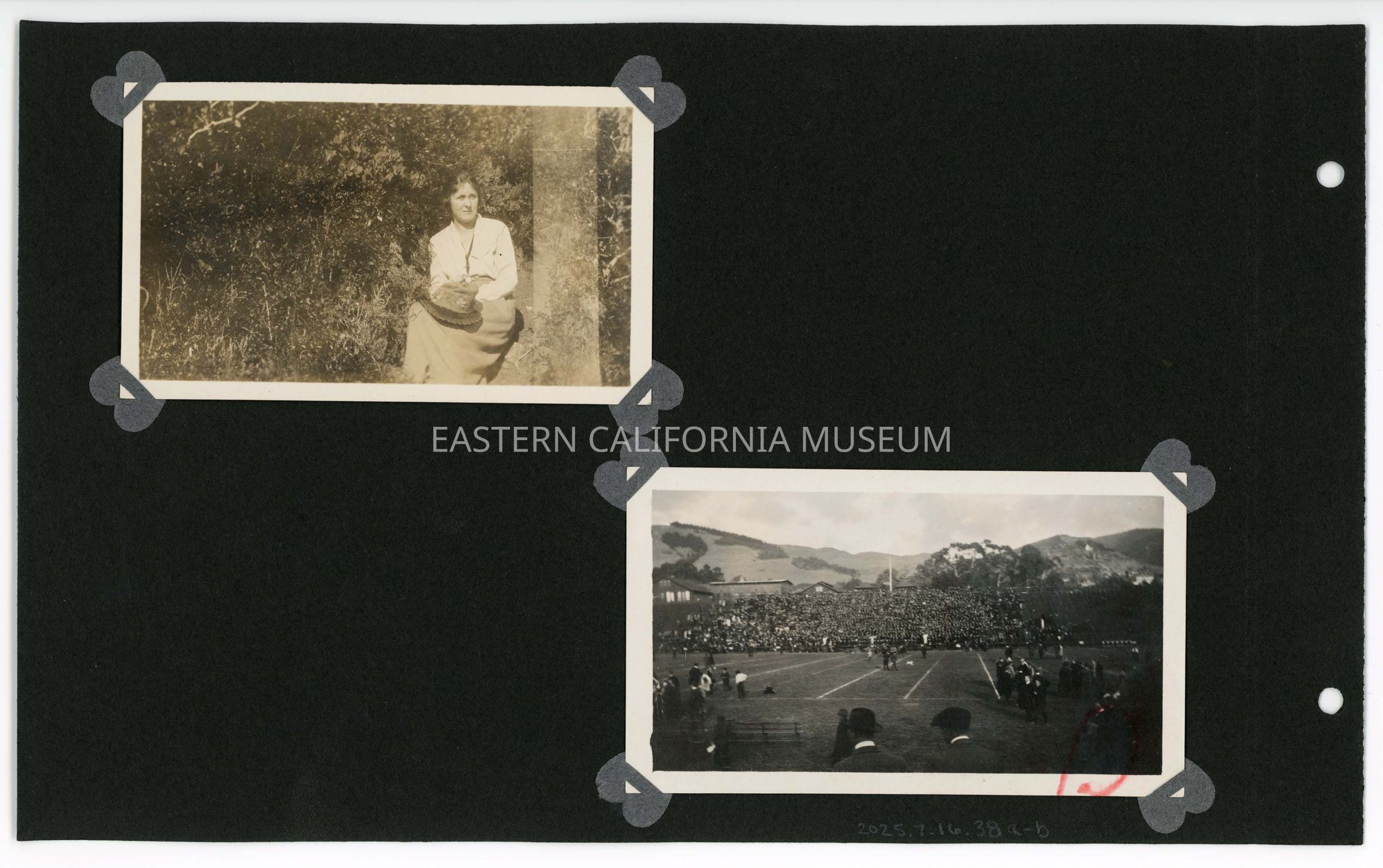 2025.7.16.38b--Photo of a big stadium filled with people. There are mountains in the background. Red ink in lower right corner. It might be Memorial Stadium or California Field at UC Berkeley.Collection