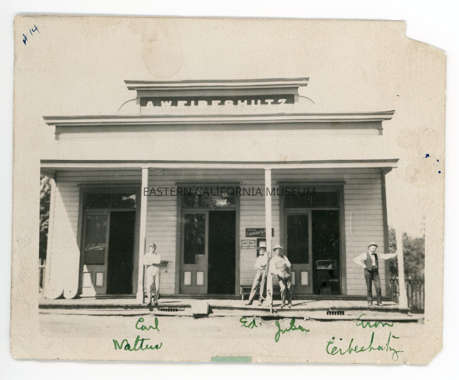 Photo of four men posing on the front porch of the A. W. Eibeshutz store in Independence. They are identified in green ink from left to right as Carl Walters, Ed, Julian [Eibeshutz?], and Aron [Eibeshutz]. There is an advertisement on the wall for something to do with "Fireman's." Someone has written "#14" in blue ink in the upper left corner.