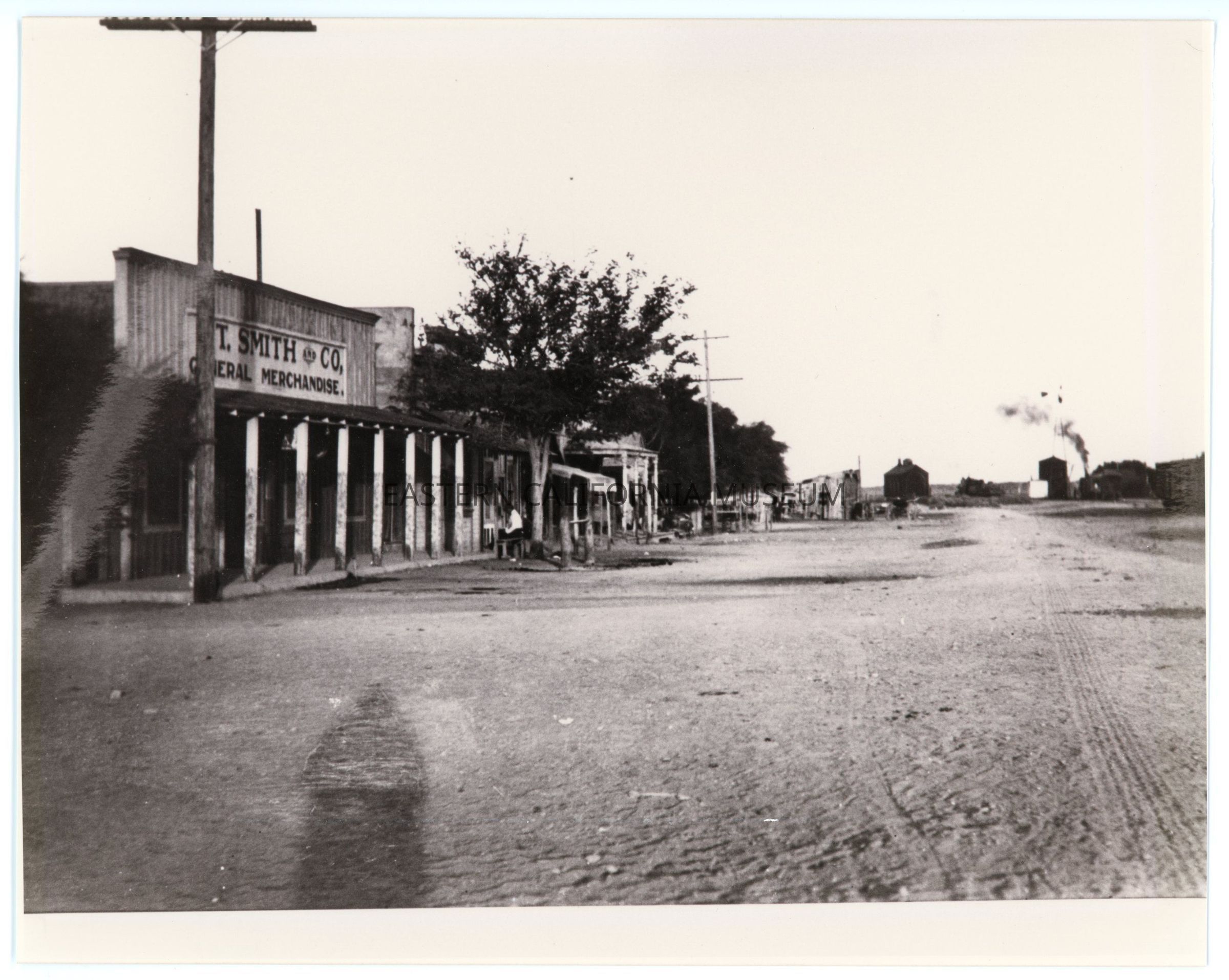 Copy of a photo of Keeler's main street showing the A. T. Smith and Co. General Merchandise store. The shadow of the photographer is visible in the lower left corner. Also visible are hitching posts, a train with a head of steam or smoke, and tire treads in the dirt.Collection