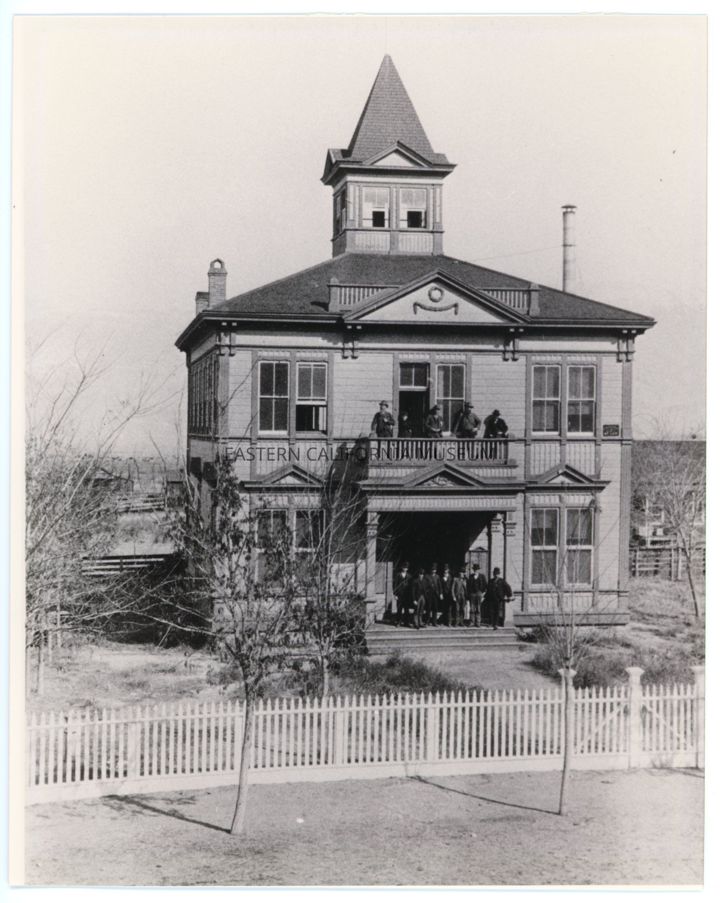 Copy of a photo of the third courthouse with a white picket fence in front and a row of young trees planted in the foreground. There are people standing on the balcony (5) and front porch (7).The people standing below appear to be very well dressed, and some might be wearing top hats.Photograph Details