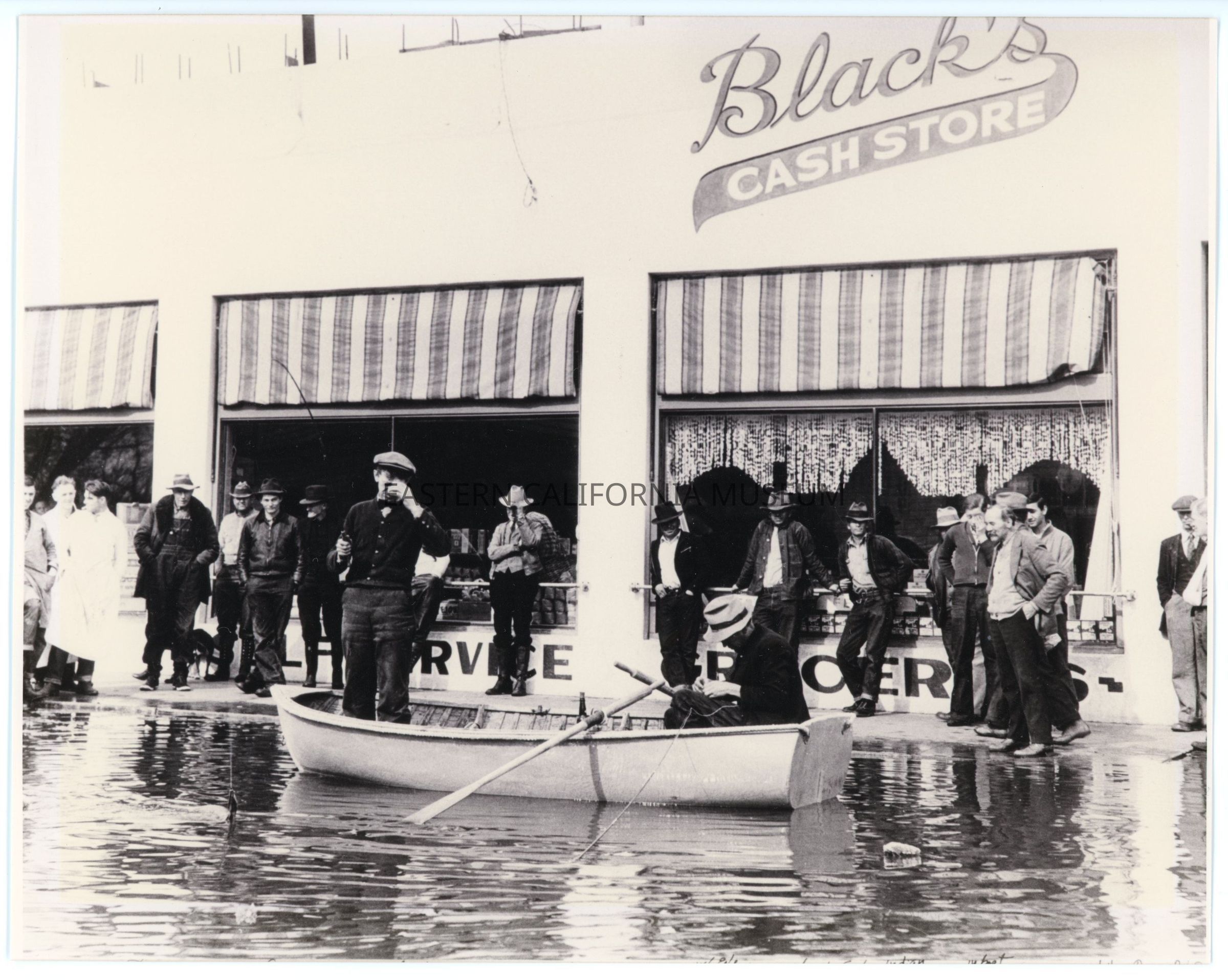 Copy of a photo of a crowd of men standing on the sidewalk in front of Black's Cash Store in Bishop after a flood/downpour. There is a canoe floating in front of the store in the street. In the boat are Carl Nellen (standing) and Myron Hartshorn (sitting). Behind the boat on the sidewalk are Donald Dean, Cap Aubrey, Hans Lofs, unknown, Robert Pellisier, Claude Ford (with his hand on hat), George Brown, Julian Romero, Tony Provice (with no hat), Bob Schoch (with his hands in pocket), and Joel Cambria (in back of them). These identifications may have been provided by Milovich.Photograph Details