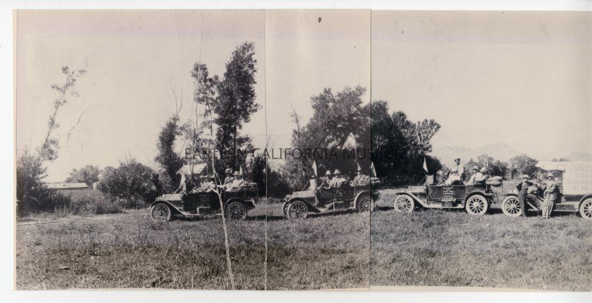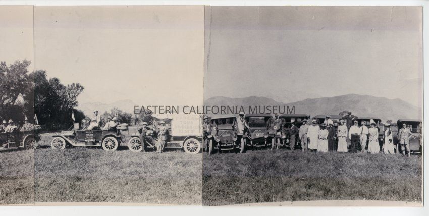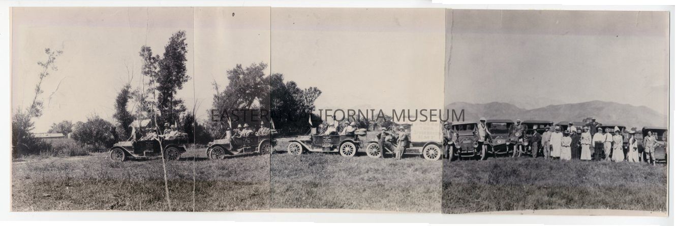 Copy of a panorama photograph that was printed on three sheets of Kodak photo paper and then affixed together. Photo is of a row of cars and people wearing driving/riding clothes in a field with mountains behind them. One of the vehicles has a sign that says, "Inyo Good Road Club / Pasear Tour / Studebaker / EMF." Several of the cars have flags or pennants.Collection