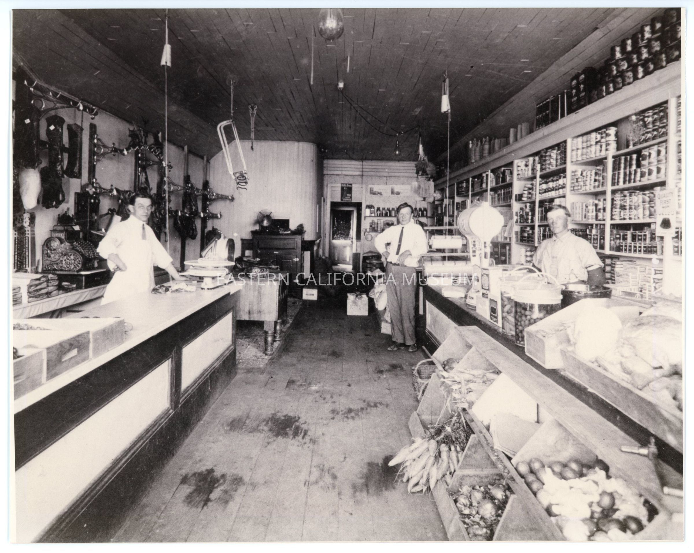 Copy of a photo of a store interior (identified as a shop in Bishop) with three men. The man in back is identified as Frank Arcularius. An advertisement on a shelf says "Quality First with JELL-O." Possibly the left side of the store is a butcher's shop. Right side is lined with shelves full of cans and jars with fresh vegetables in crates in front of the counter.Photograph Details